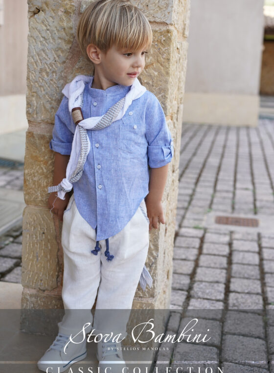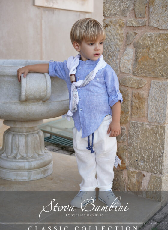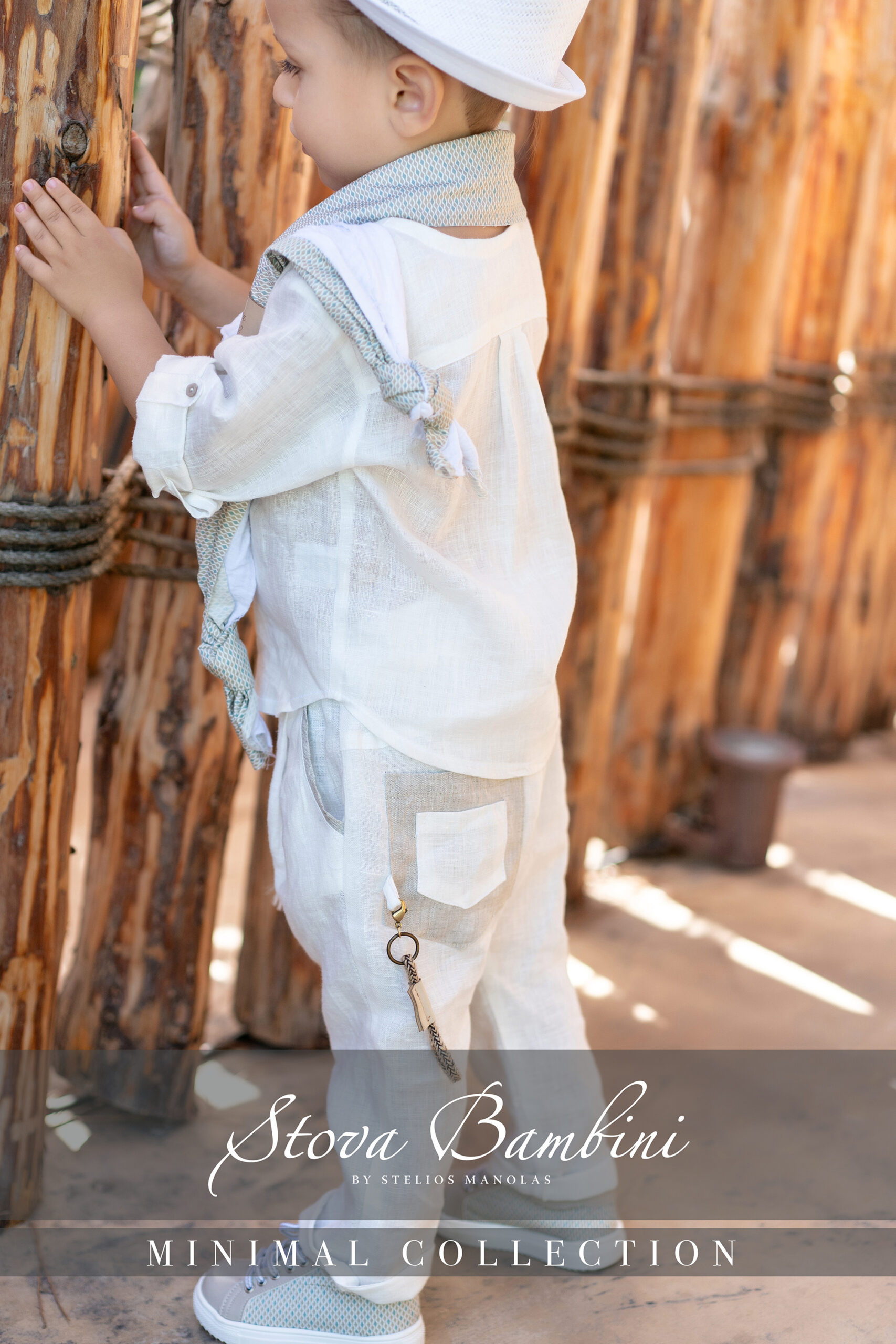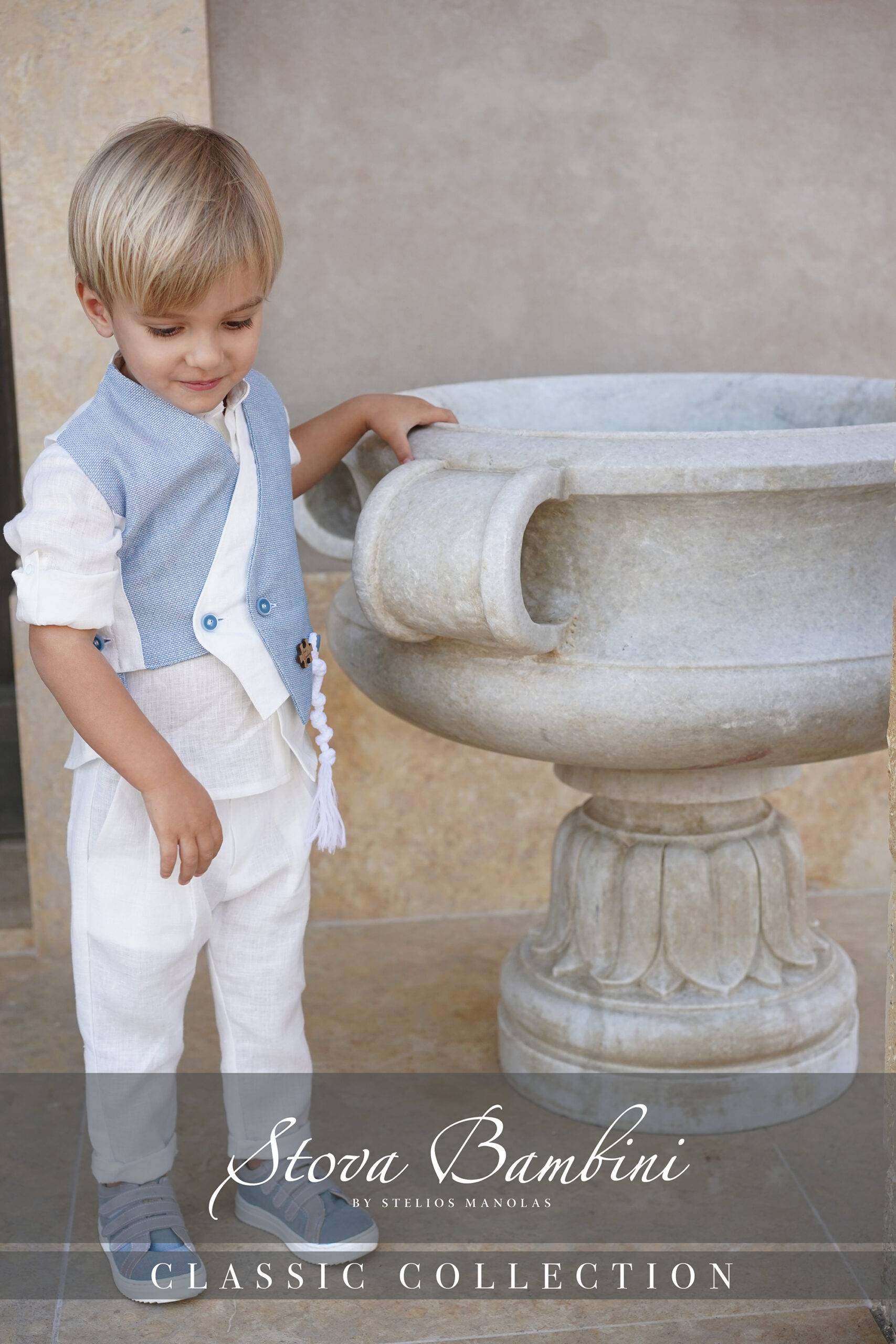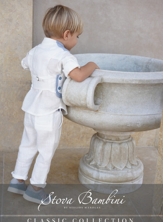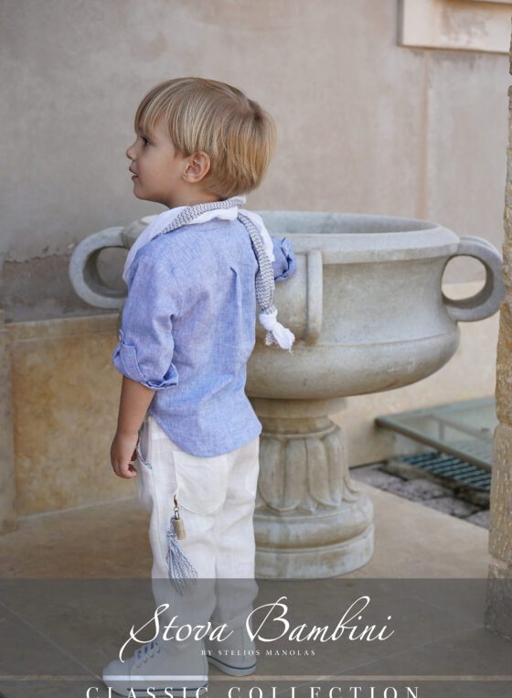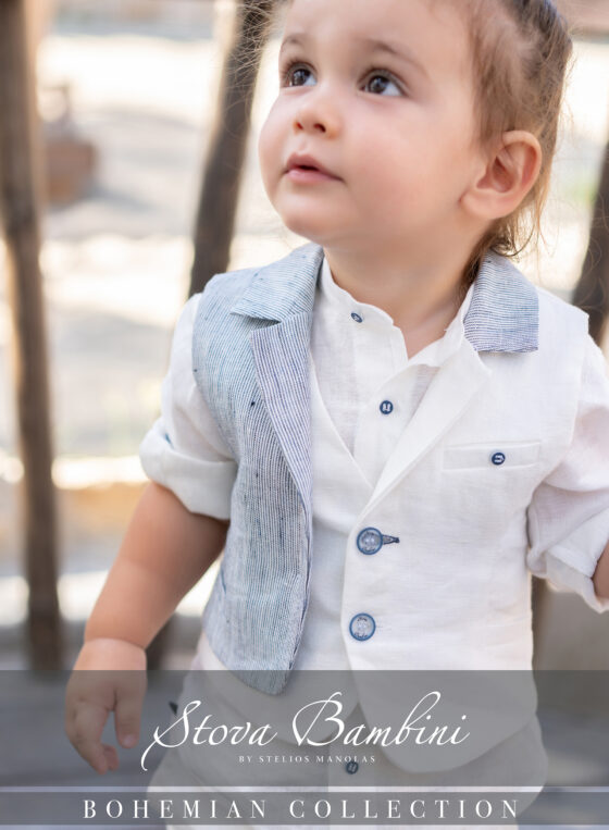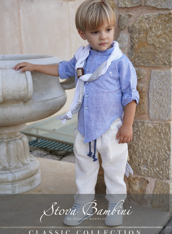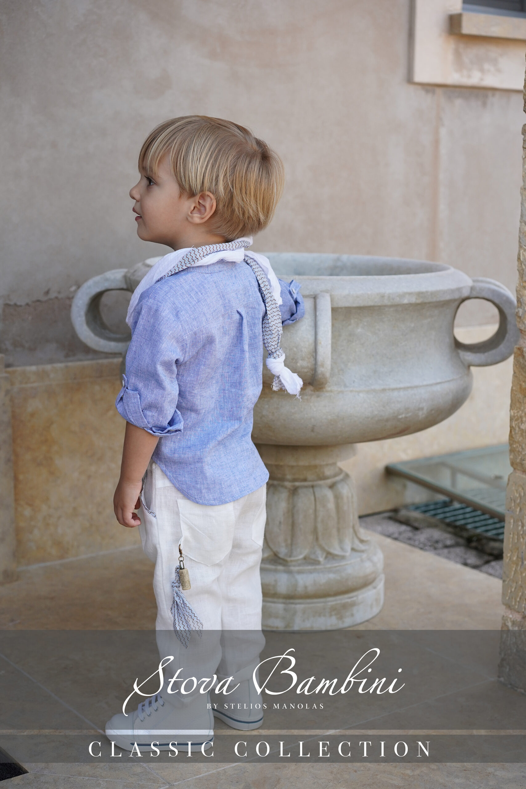 Η νέα σειρά Stova Bambini, μια πιο ανάλαφρη, μοντέρνα πρόταση βάπτισης με υπέροχο νέο, ασύμμετρο πουκάμισο, με διπλά διακοσμητικά τσεπάκια, σε λινό σιέλ. Συνδυάζεται με υπέροχο διπλό φουλάρι σε λευκό και διακριτικό print σε ασορτί χρώμα και δερμάτινο branding catch Stova Bambini από δέρμα νάπα (nappa). Το παντελόνι είναι λινό σε off white με λάστιχο στη μέση, κορδόνι σύσφιξης και διακοσμητικό, αποσπώμενο αξεσουάρ στο πίσω μέρος. Το σετ περιλαμβάνει 5 τεμάχια (πουκάμισο, φουλάρι, παντελόνι, διακοσμητικό αποσπώμενο αξεσουάρ, καπέλο). Συνδυάζεται με ασορτί ανατομικά παπούτσια με το ύφασμα του ρούχου εξωτερικά. Σχεδιάστε τη βάπτιση των ονείρων σας, κάθε ρούχο συνδυάζεται με ανάλογο φιόγκο για το κουτί ή την βαλίτσα σας, λαμπάδα, λαδόπανα, εσώρουχα, πετσέτες και σετ κολυμπήθρας (κεράκια-σαπούνι-μπουκάλι λαδιού), είτε διακοσμημένο και με το θέμα της επιλογής σας. Διατίθεται μεγεθολόγιο Stova Bambini σε όλα τα καταστήματα. Όλη η συλλογή σχεδιάζεται και κατασκευάζεται στην Ελλάδα. Διαθέσιμα μεγέθη: 6-9 μηνών, 9-12 μηνών, 12-18 μηνών, 18-24 μηνών, 24-36 και κατά παραγγελία μεγαλύτερα μεγέθη.