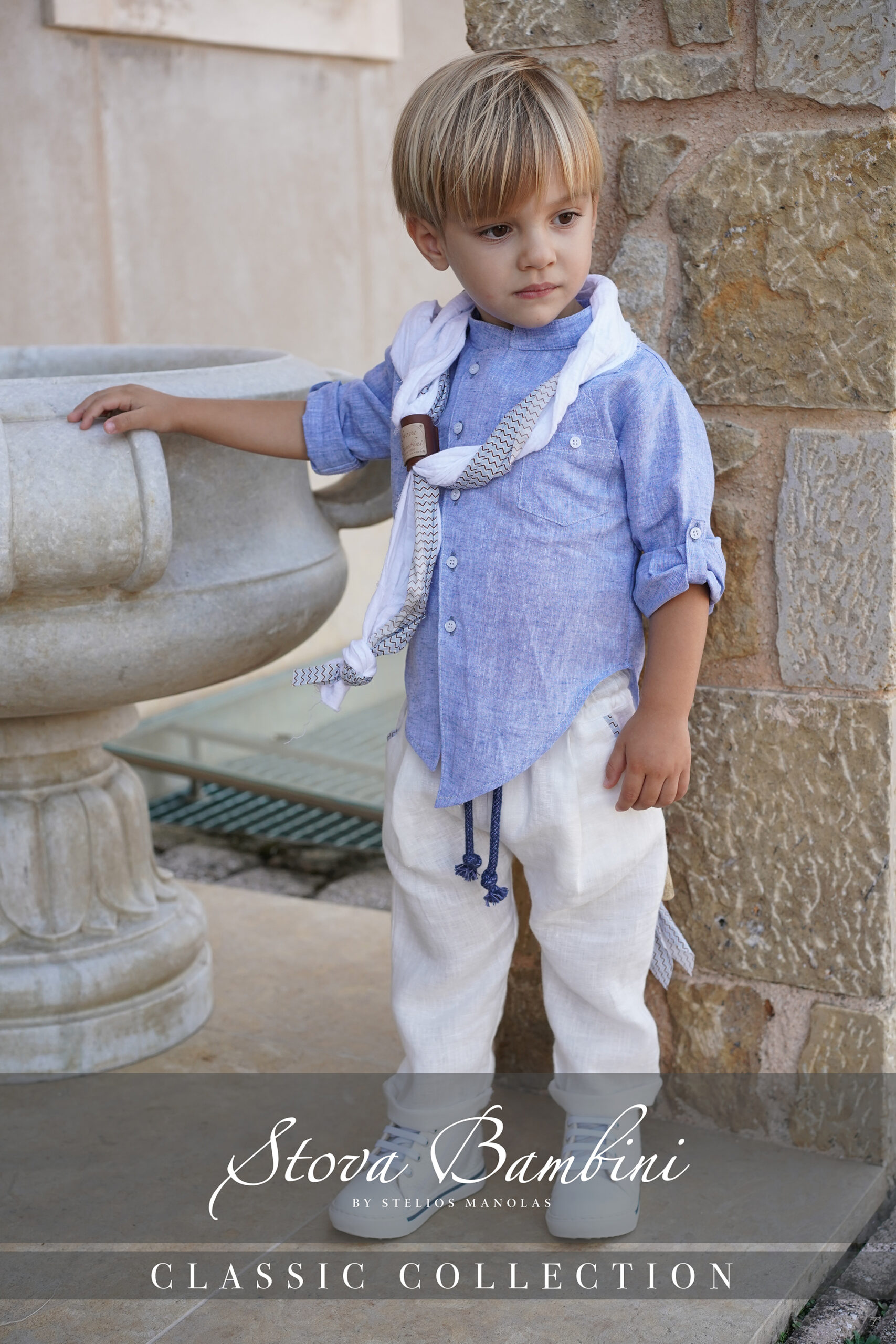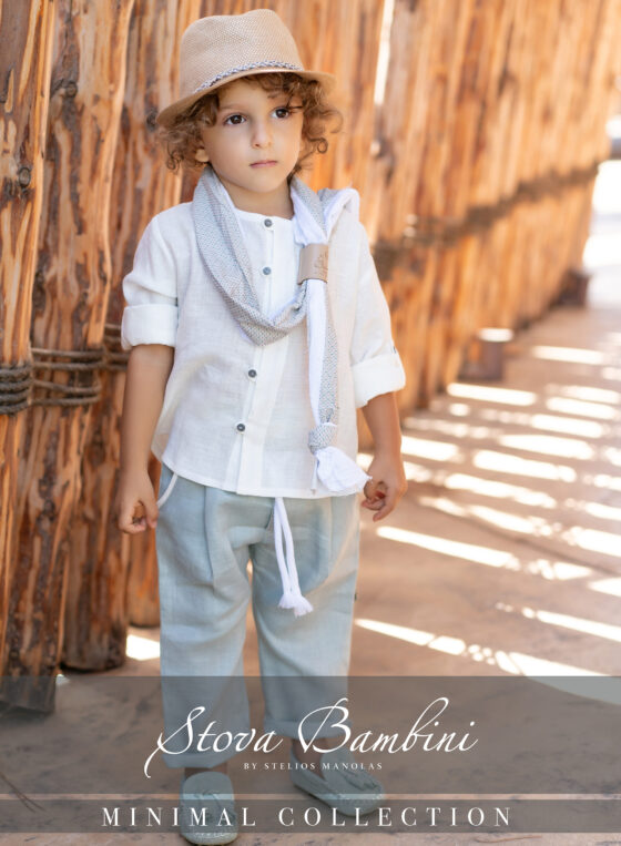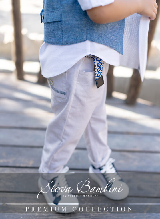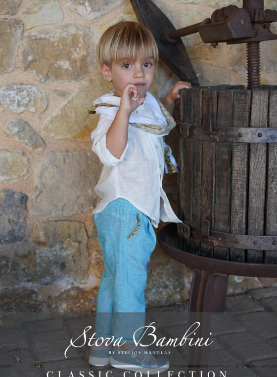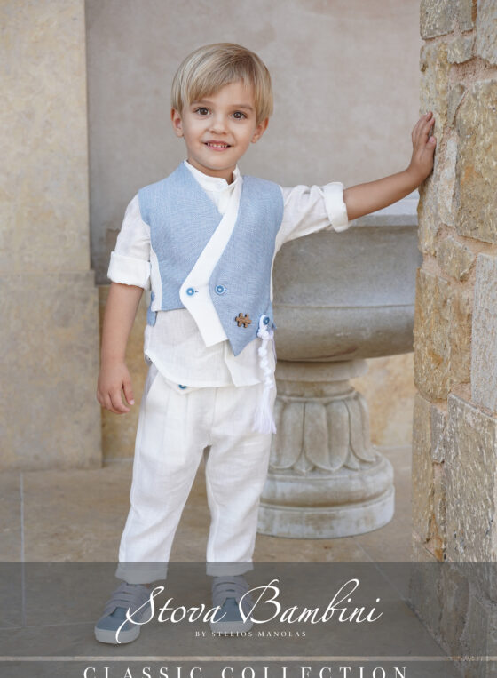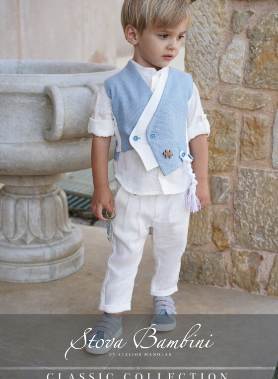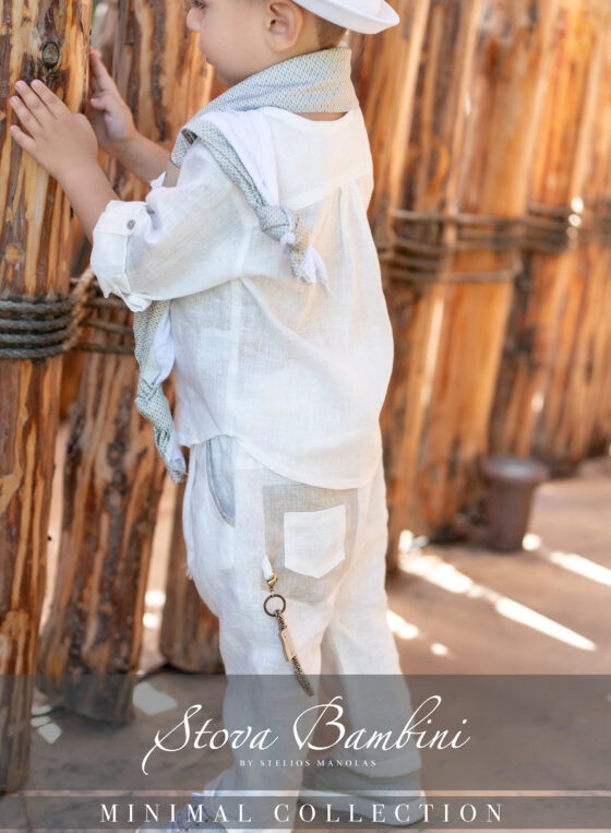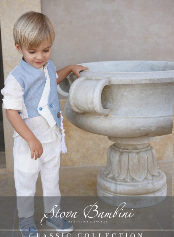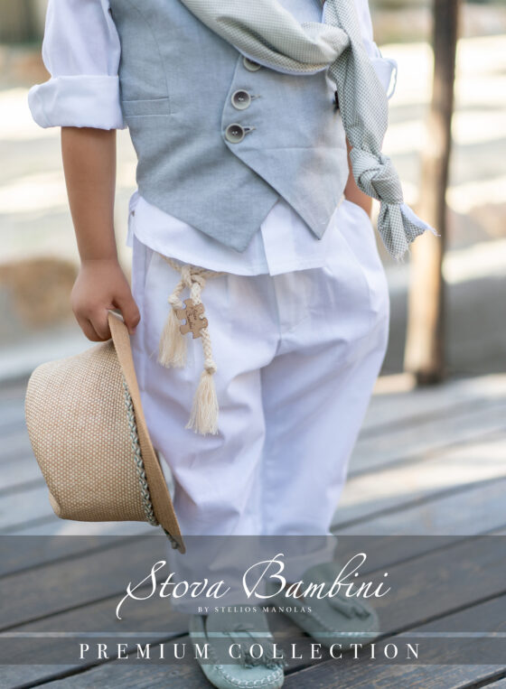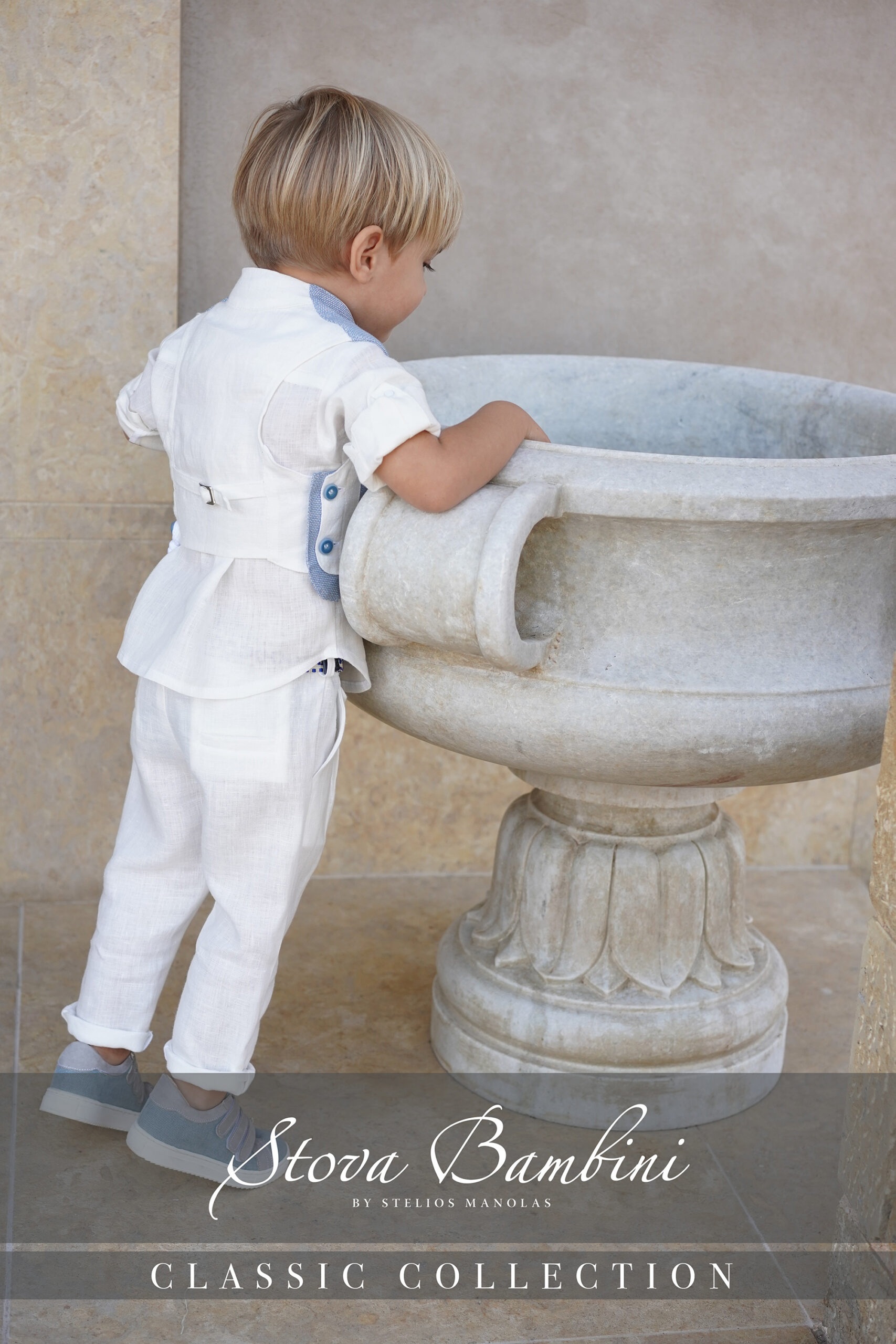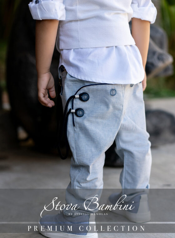 Η νέα σειρά Stova Bambini, μια πιο ανάλαφρη, μοντέρνα πρόταση βάπτισης με υπέροχο νέο, ασύμμετρο πουκάμισο, με διπλά διακοσμητικά τσεπάκια, σε λινό σιέλ. Συνδυάζεται με υπέροχο διπλό φουλάρι σε λευκό και διακριτικό print σε ασορτί χρώμα και δερμάτινο branding catch Stova Bambini από δέρμα νάπα (nappa). Το παντελόνι είναι λινό σε off white με λάστιχο στη μέση, κορδόνι σύσφιξης και διακοσμητικό, αποσπώμενο αξεσουάρ στο πίσω μέρος. Το σετ περιλαμβάνει 5 τεμάχια (πουκάμισο, φουλάρι, παντελόνι, διακοσμητικό αποσπώμενο αξεσουάρ, καπέλο). Συνδυάζεται με ασορτί ανατομικά παπούτσια με το ύφασμα του ρούχου εξωτερικά. Σχεδιάστε τη βάπτιση των ονείρων σας, κάθε ρούχο συνδυάζεται με ανάλογο φιόγκο για το κουτί ή την βαλίτσα σας, λαμπάδα, λαδόπανα, εσώρουχα, πετσέτες και σετ κολυμπήθρας (κεράκια-σαπούνι-μπουκάλι λαδιού), είτε διακοσμημένο και με το θέμα της επιλογής σας. Διατίθεται μεγεθολόγιο Stova Bambini σε όλα τα καταστήματα. Όλη η συλλογή σχεδιάζεται και κατασκευάζεται στην Ελλάδα. Διαθέσιμα μεγέθη: 6-9 μηνών, 9-12 μηνών, 12-18 μηνών, 18-24 μηνών, 24-36 και κατά παραγγελία μεγαλύτερα μεγέθη.