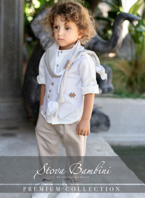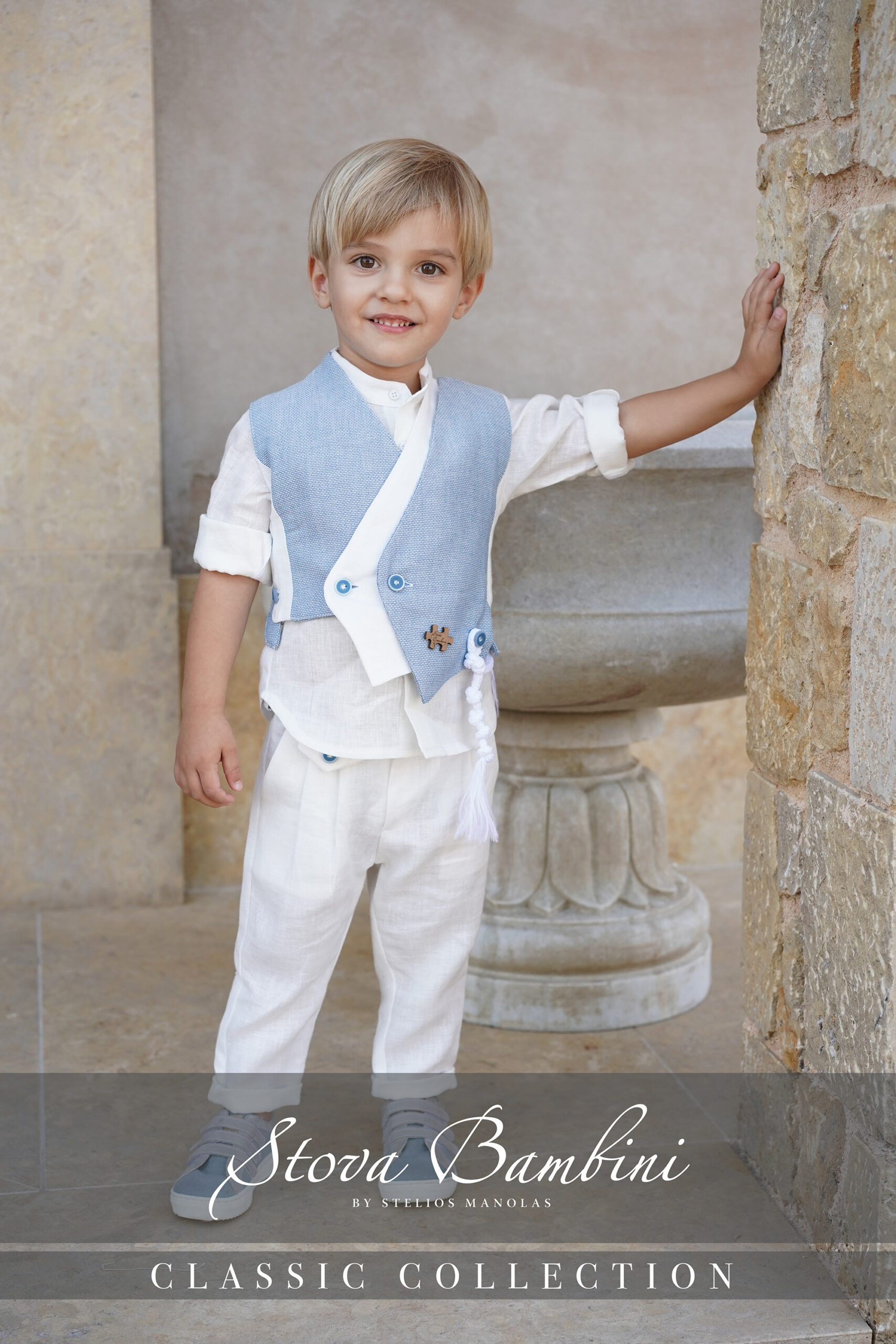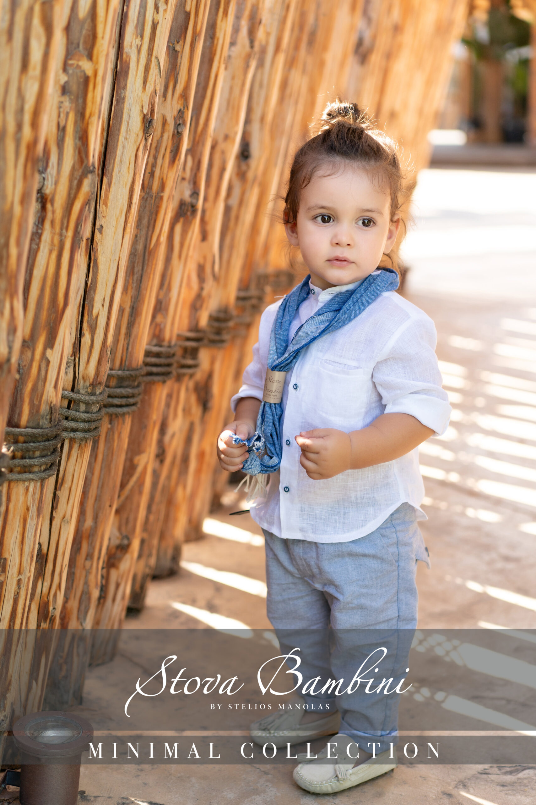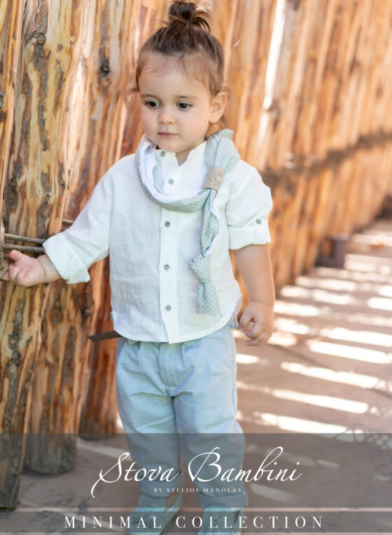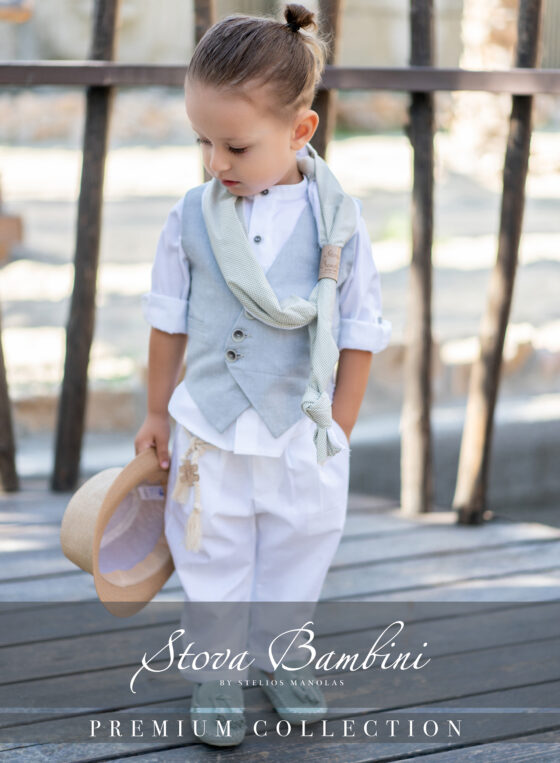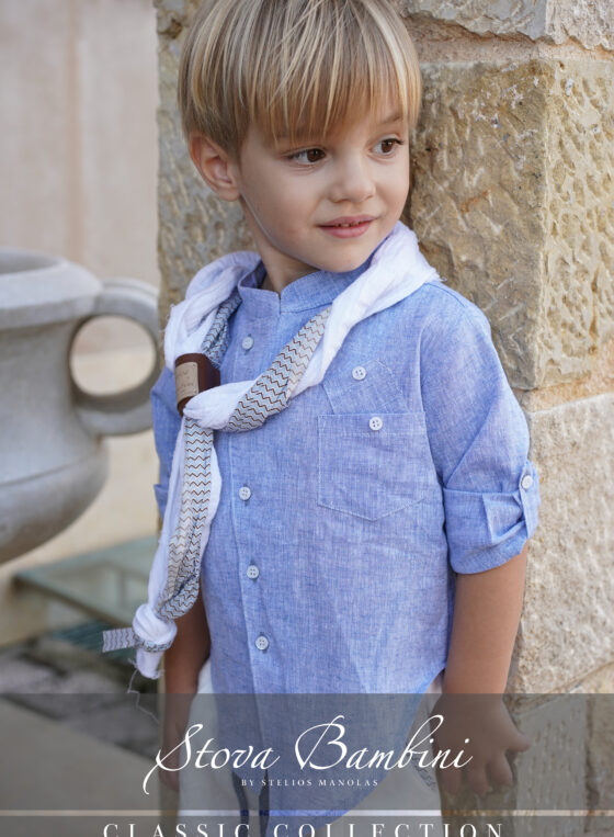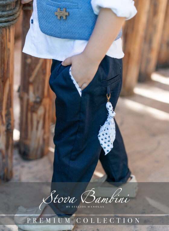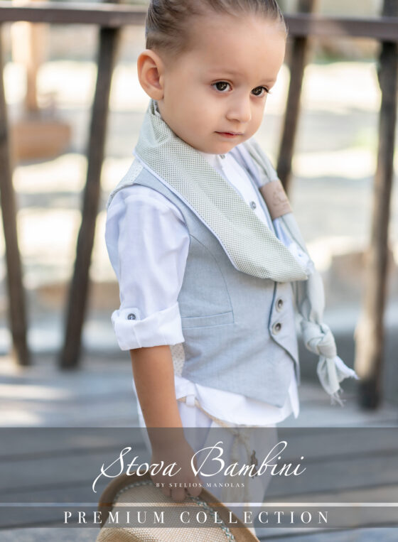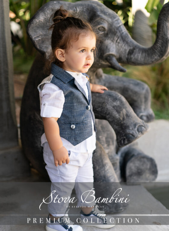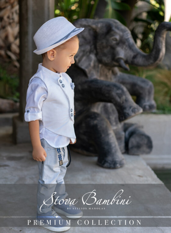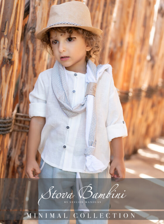 Η νέα σειρά Stova Bambini, μια πιο ανάλαφρη, μοντέρνα πρόταση βάπτισης με υπέροχο νέο, ασύμμετρο πουκάμισο, με διπλά διακοσμητικά τσεπάκια, σε λινό σιέλ. Συνδυάζεται με υπέροχο διπλό φουλάρι σε λευκό και διακριτικό print σε ασορτί χρώμα και δερμάτινο branding catch Stova Bambini από δέρμα νάπα (nappa). Το παντελόνι είναι λινό σε off white με λάστιχο στη μέση, κορδόνι σύσφιξης και διακοσμητικό, αποσπώμενο αξεσουάρ στο πίσω μέρος. Το σετ περιλαμβάνει 5 τεμάχια (πουκάμισο, φουλάρι, παντελόνι, διακοσμητικό αποσπώμενο αξεσουάρ, καπέλο). Συνδυάζεται με ασορτί ανατομικά παπούτσια με το ύφασμα του ρούχου εξωτερικά. Σχεδιάστε τη βάπτιση των ονείρων σας, κάθε ρούχο συνδυάζεται με ανάλογο φιόγκο για το κουτί ή την βαλίτσα σας, λαμπάδα, λαδόπανα, εσώρουχα, πετσέτες και σετ κολυμπήθρας (κεράκια-σαπούνι-μπουκάλι λαδιού), είτε διακοσμημένο και με το θέμα της επιλογής σας. Διατίθεται μεγεθολόγιο Stova Bambini σε όλα τα καταστήματα. Όλη η συλλογή σχεδιάζεται και κατασκευάζεται στην Ελλάδα. Διαθέσιμα μεγέθη: 6-9 μηνών, 9-12 μηνών, 12-18 μηνών, 18-24 μηνών, 24-36 και κατά παραγγελία μεγαλύτερα μεγέθη.