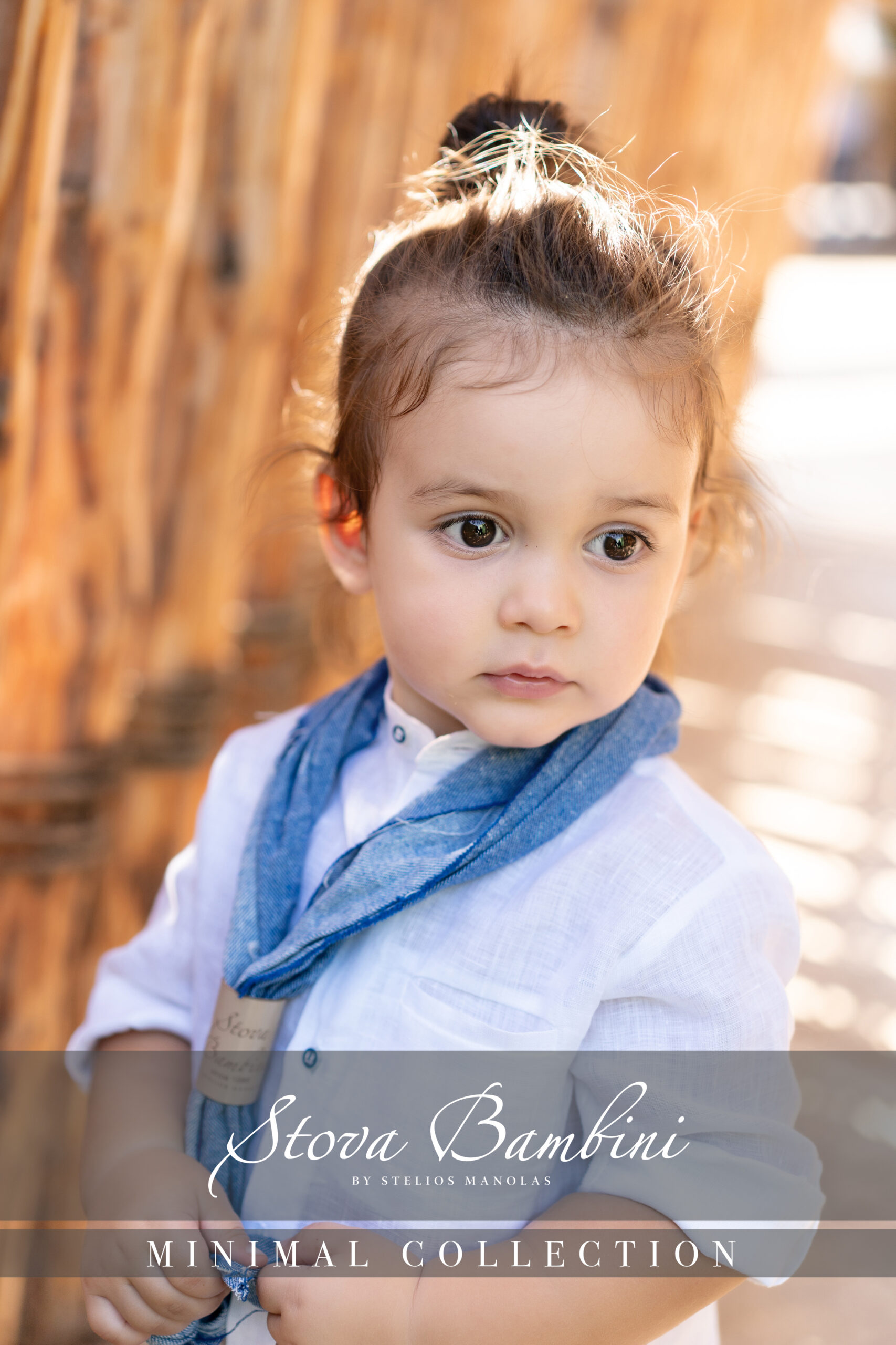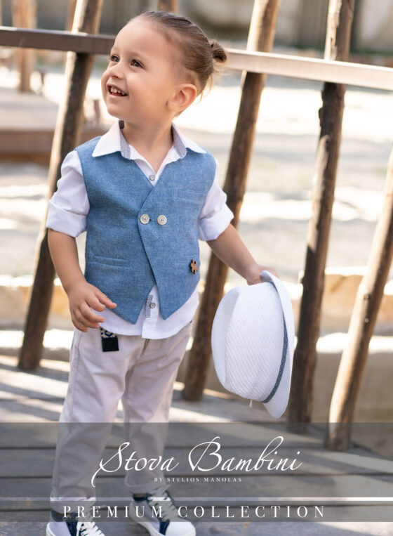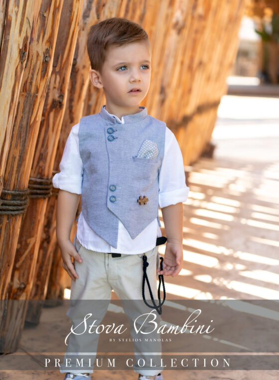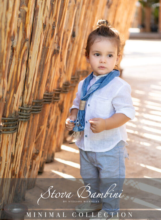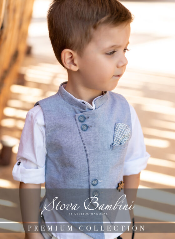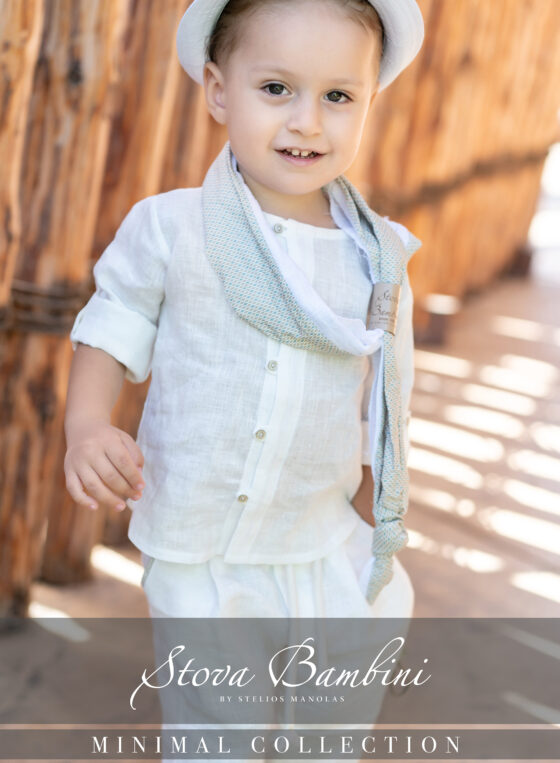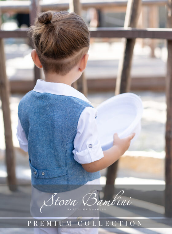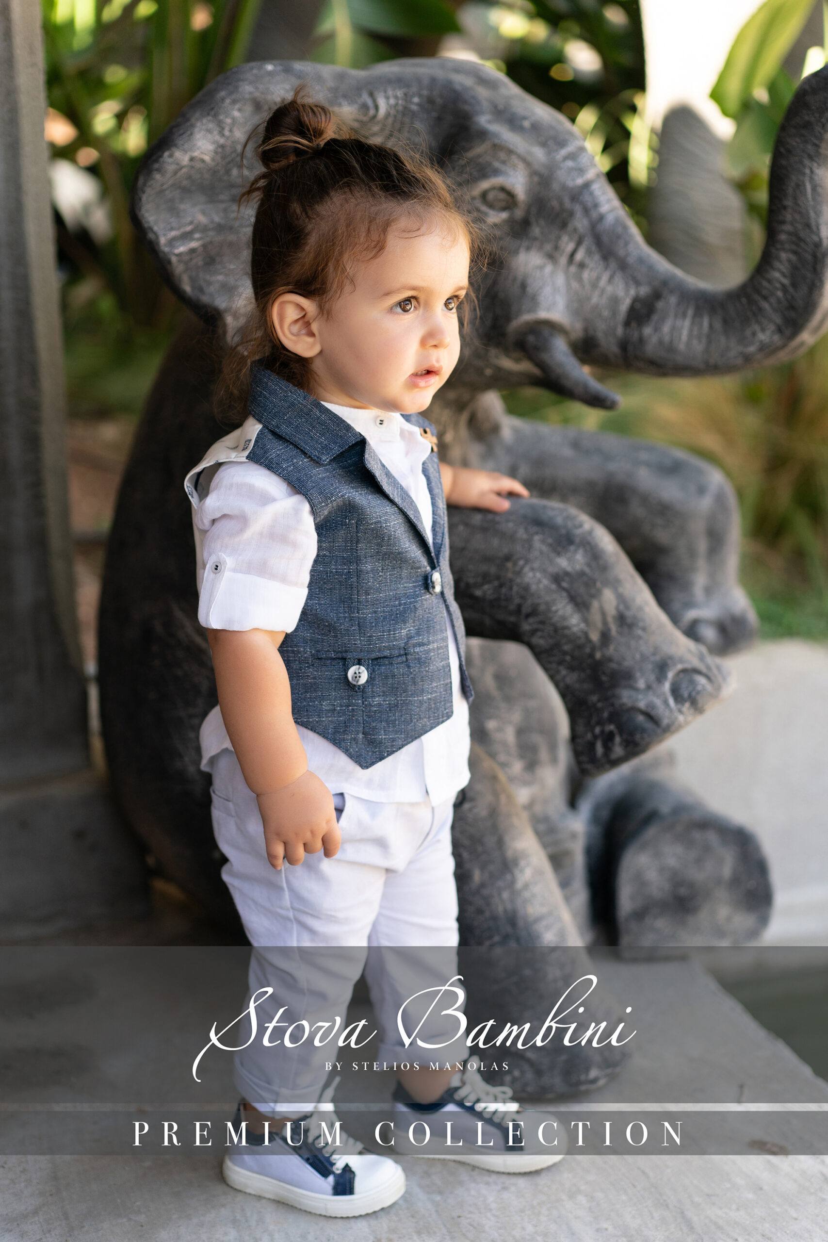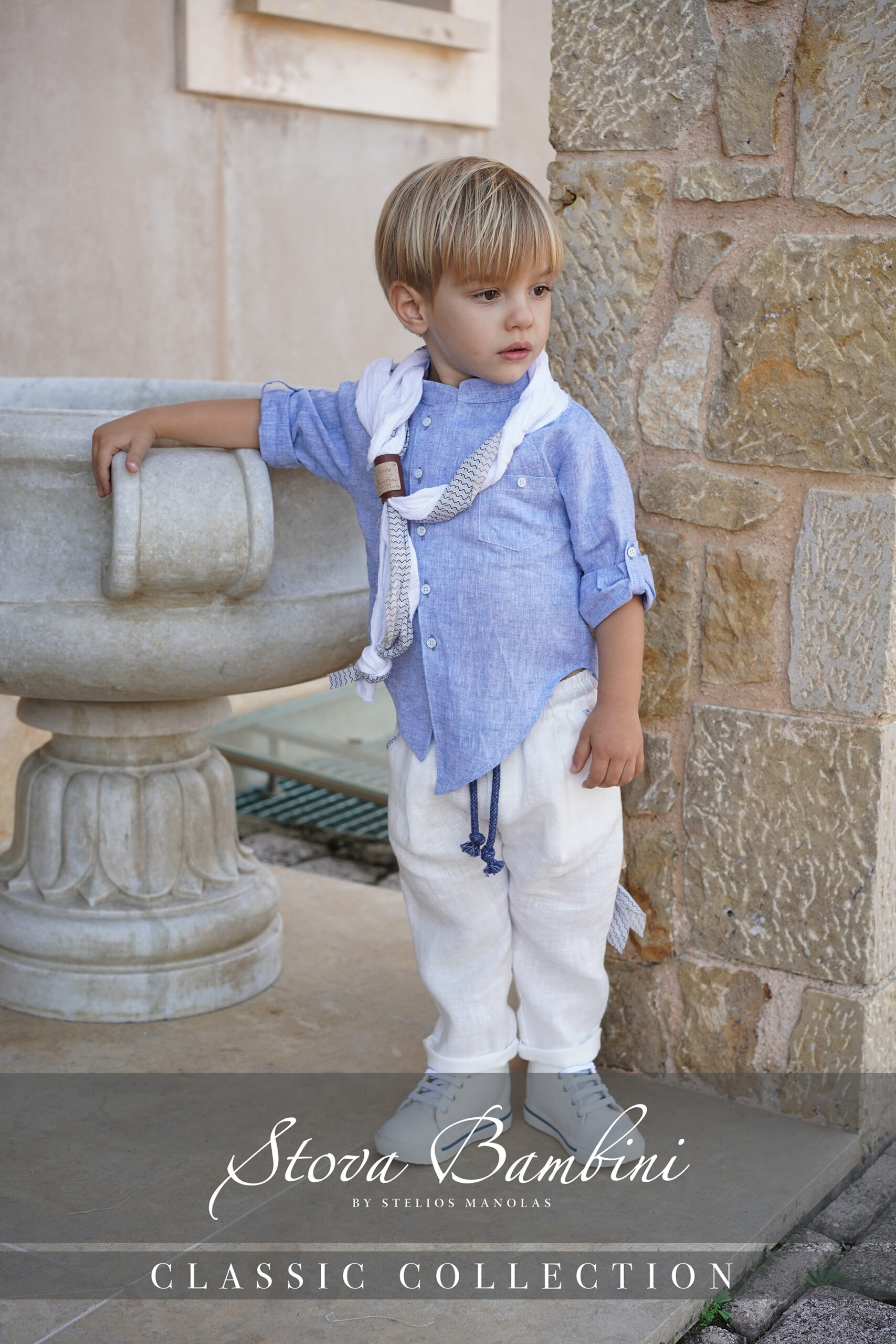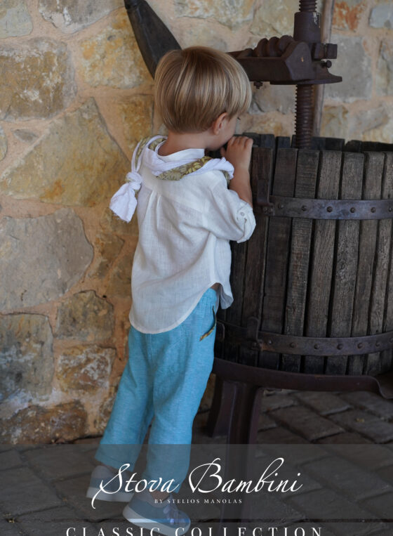 Η νέα σειρά Stova Bambini, μια πιο ανάλαφρη, μοντέρνα πρόταση βάπτισης με υπέροχο νέο, ασύμμετρο πουκάμισο, με διπλά διακοσμητικά τσεπάκια, σε λινό σιέλ. Συνδυάζεται με υπέροχο διπλό φουλάρι σε λευκό και διακριτικό print σε ασορτί χρώμα και δερμάτινο branding catch Stova Bambini από δέρμα νάπα (nappa). Το παντελόνι είναι λινό σε off white με λάστιχο στη μέση, κορδόνι σύσφιξης και διακοσμητικό, αποσπώμενο αξεσουάρ στο πίσω μέρος. Το σετ περιλαμβάνει 5 τεμάχια (πουκάμισο, φουλάρι, παντελόνι, διακοσμητικό αποσπώμενο αξεσουάρ, καπέλο). Συνδυάζεται με ασορτί ανατομικά παπούτσια με το ύφασμα του ρούχου εξωτερικά. Σχεδιάστε τη βάπτιση των ονείρων σας, κάθε ρούχο συνδυάζεται με ανάλογο φιόγκο για το κουτί ή την βαλίτσα σας, λαμπάδα, λαδόπανα, εσώρουχα, πετσέτες και σετ κολυμπήθρας (κεράκια-σαπούνι-μπουκάλι λαδιού), είτε διακοσμημένο και με το θέμα της επιλογής σας. Διατίθεται μεγεθολόγιο Stova Bambini σε όλα τα καταστήματα. Όλη η συλλογή σχεδιάζεται και κατασκευάζεται στην Ελλάδα. Διαθέσιμα μεγέθη: 6-9 μηνών, 9-12 μηνών, 12-18 μηνών, 18-24 μηνών, 24-36 και κατά παραγγελία μεγαλύτερα μεγέθη.