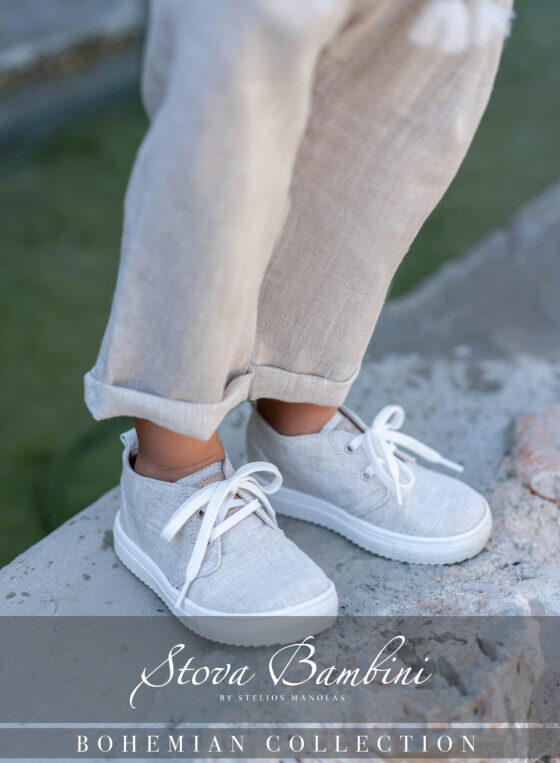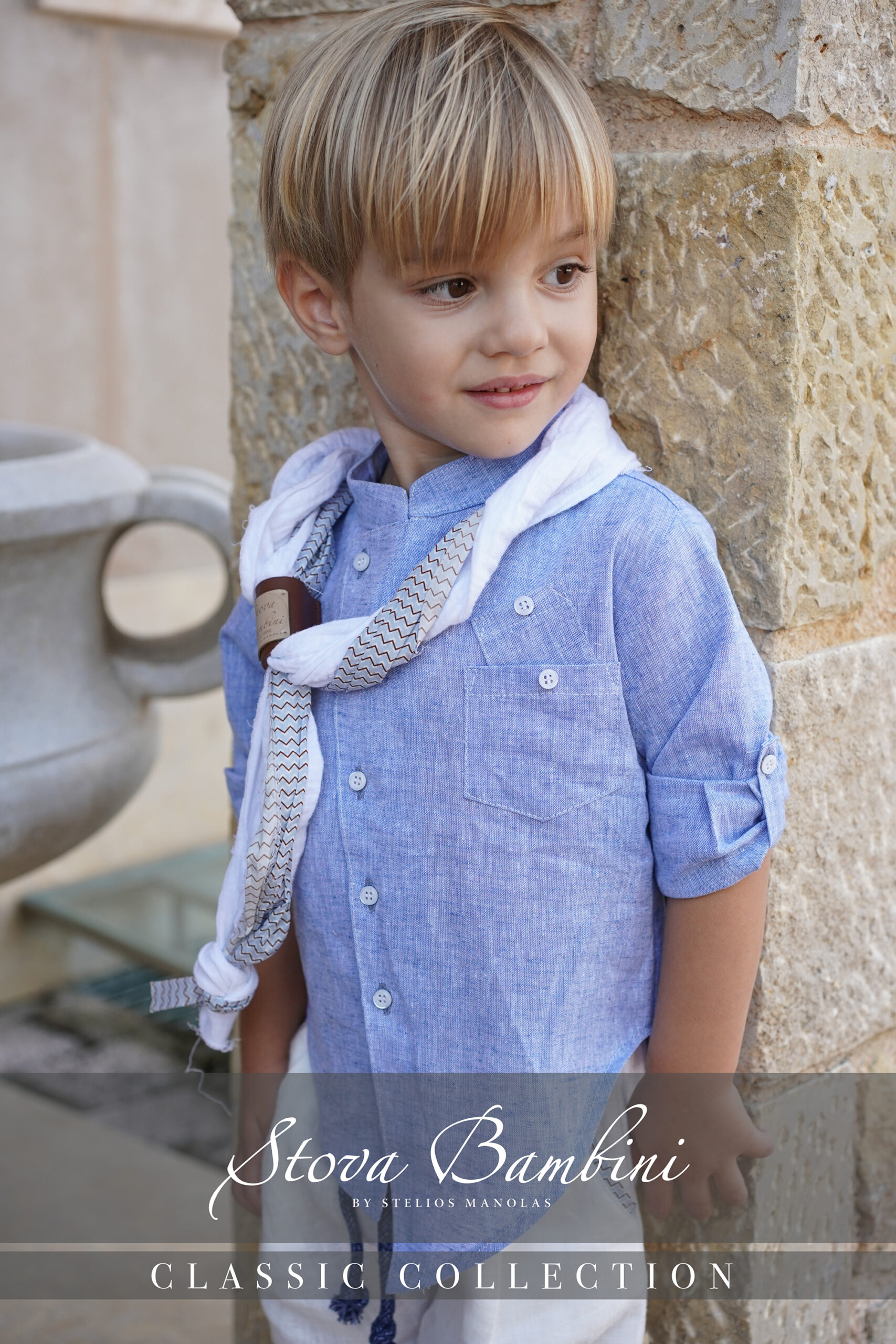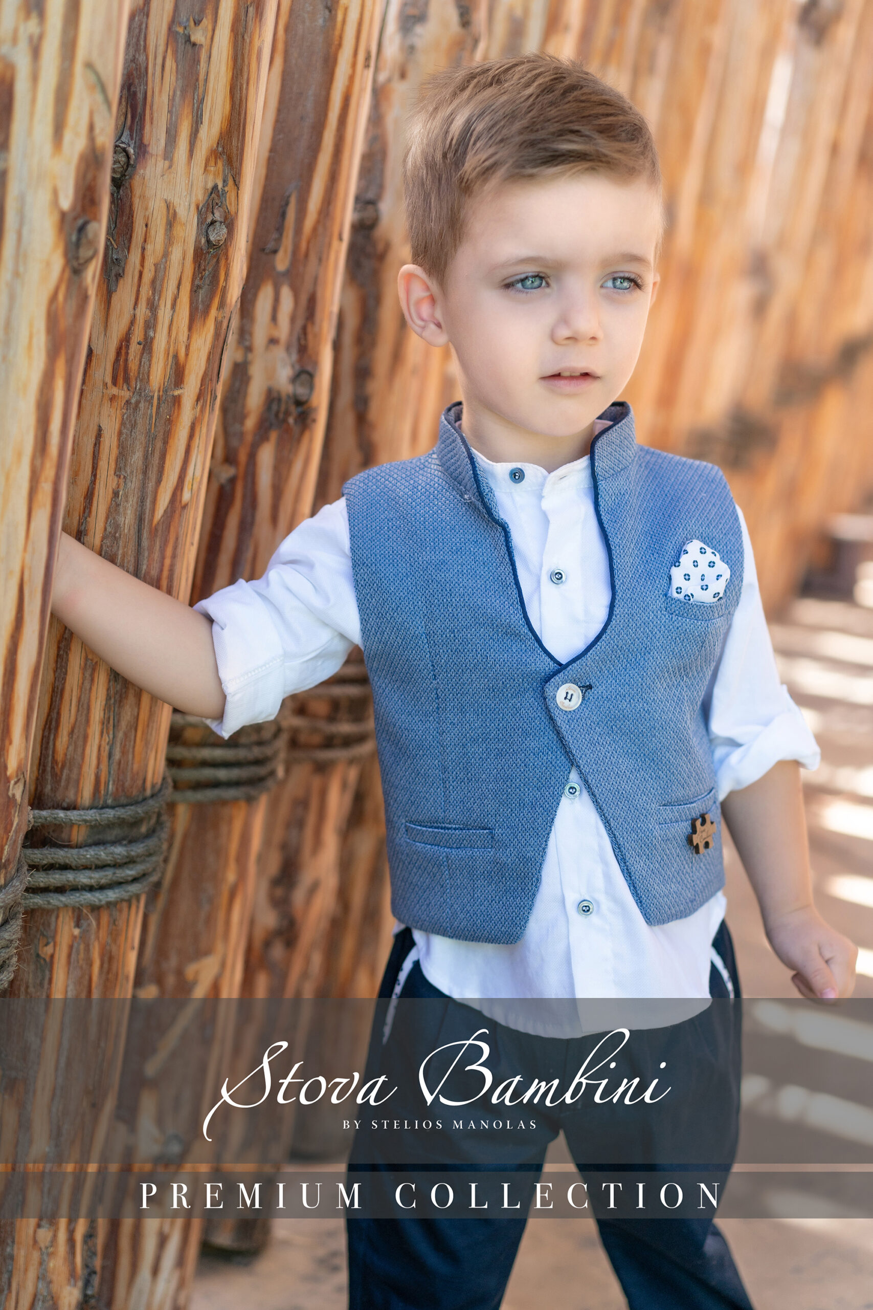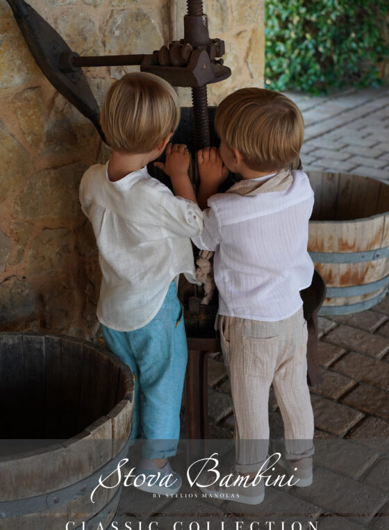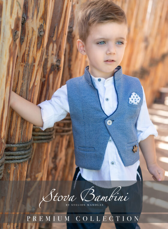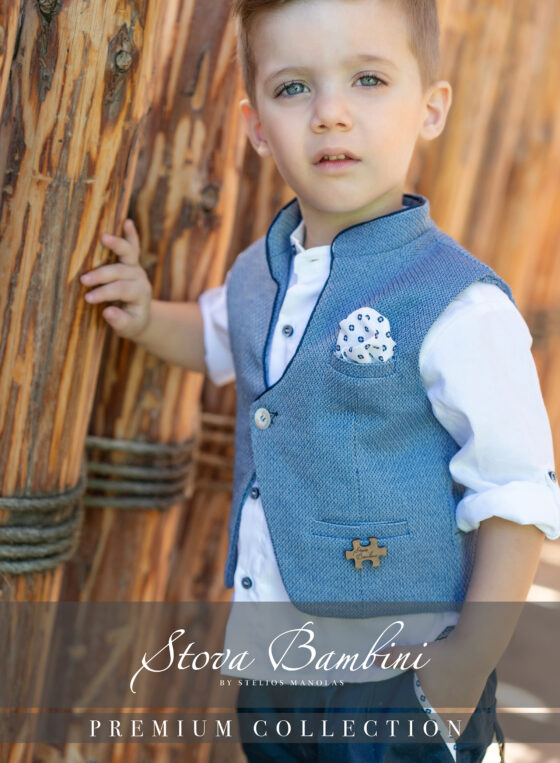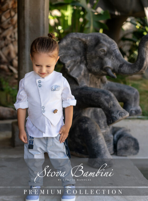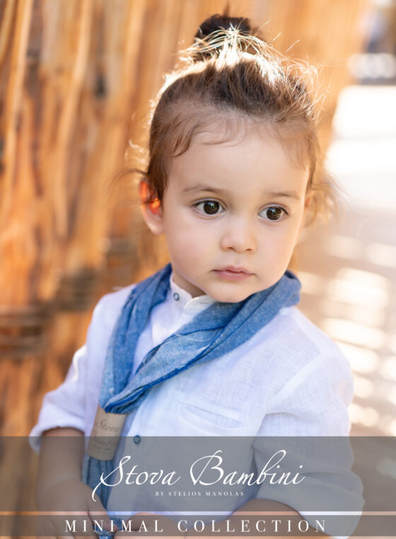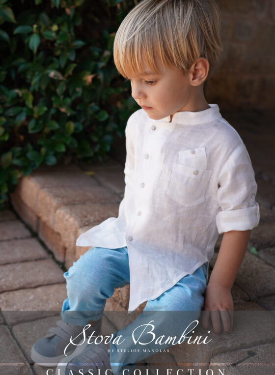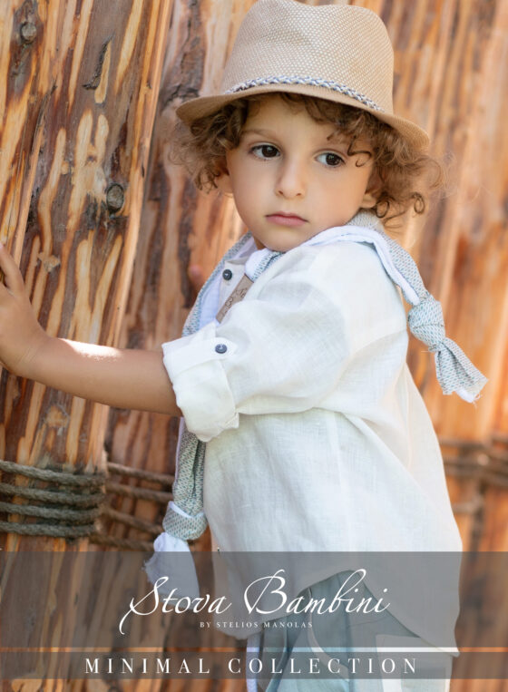 Η νέα σειρά Stova Bambini, μια πιο ανάλαφρη, μοντέρνα πρόταση βάπτισης με υπέροχο νέο, ασύμμετρο πουκάμισο, με διπλά διακοσμητικά τσεπάκια, σε λινό σιέλ. Συνδυάζεται με υπέροχο διπλό φουλάρι σε λευκό και διακριτικό print σε ασορτί χρώμα και δερμάτινο branding catch Stova Bambini από δέρμα νάπα (nappa). Το παντελόνι είναι λινό σε off white με λάστιχο στη μέση, κορδόνι σύσφιξης και διακοσμητικό, αποσπώμενο αξεσουάρ στο πίσω μέρος. Το σετ περιλαμβάνει 5 τεμάχια (πουκάμισο, φουλάρι, παντελόνι, διακοσμητικό αποσπώμενο αξεσουάρ, καπέλο). Συνδυάζεται με ασορτί ανατομικά παπούτσια με το ύφασμα του ρούχου εξωτερικά. Σχεδιάστε τη βάπτιση των ονείρων σας, κάθε ρούχο συνδυάζεται με ανάλογο φιόγκο για το κουτί ή την βαλίτσα σας, λαμπάδα, λαδόπανα, εσώρουχα, πετσέτες και σετ κολυμπήθρας (κεράκια-σαπούνι-μπουκάλι λαδιού), είτε διακοσμημένο και με το θέμα της επιλογής σας. Διατίθεται μεγεθολόγιο Stova Bambini σε όλα τα καταστήματα. Όλη η συλλογή σχεδιάζεται και κατασκευάζεται στην Ελλάδα. Διαθέσιμα μεγέθη: 6-9 μηνών, 9-12 μηνών, 12-18 μηνών, 18-24 μηνών, 24-36 και κατά παραγγελία μεγαλύτερα μεγέθη.