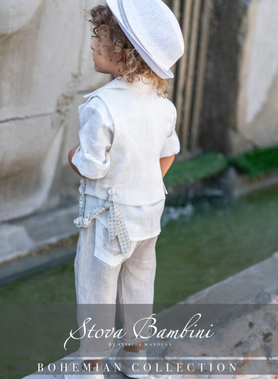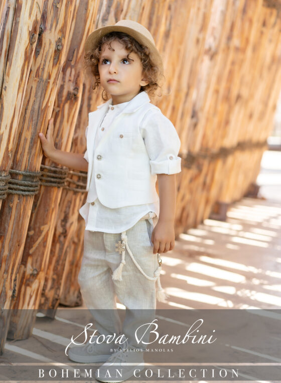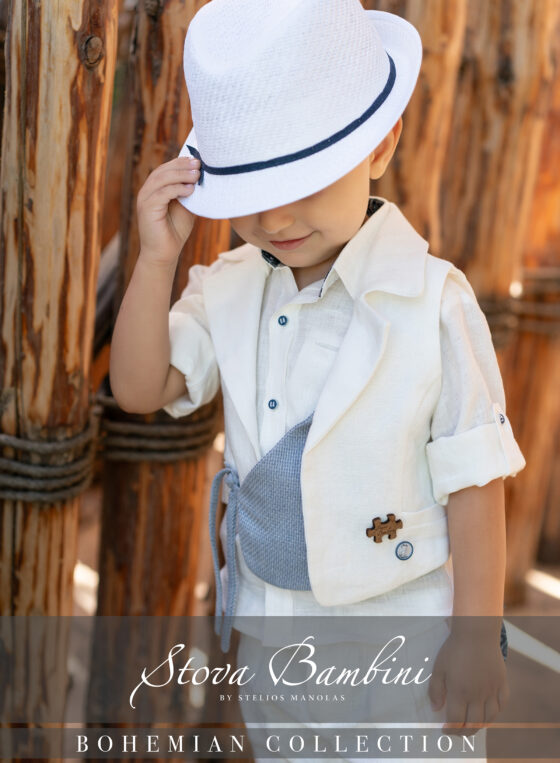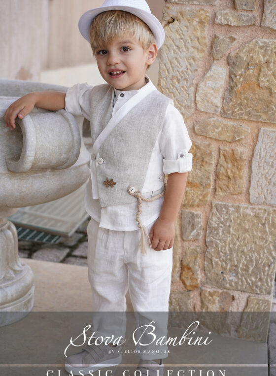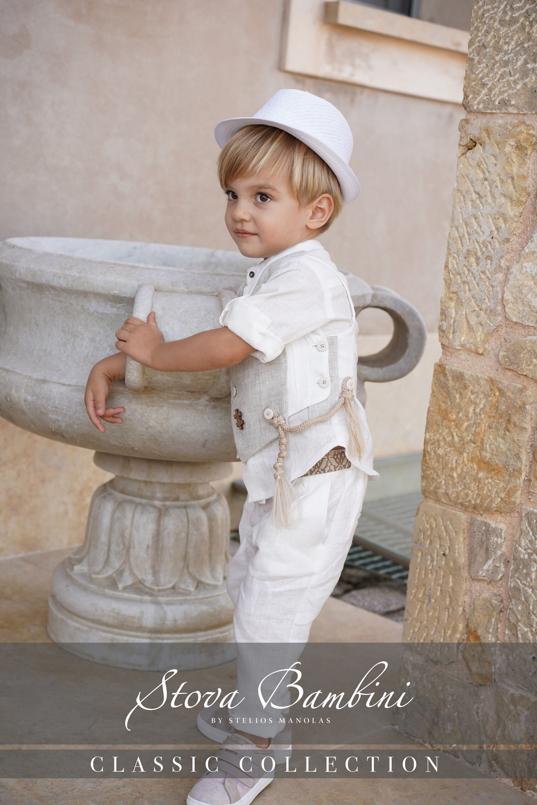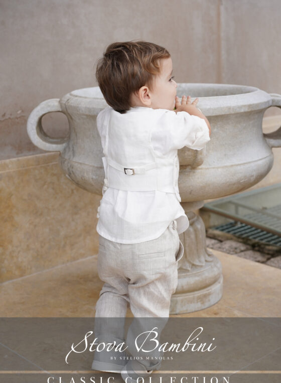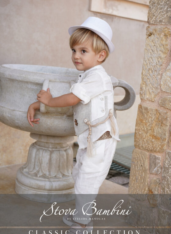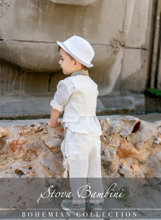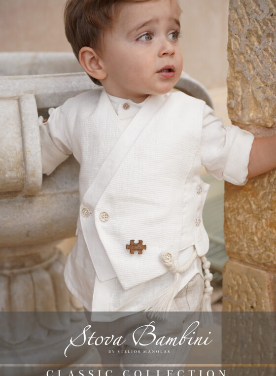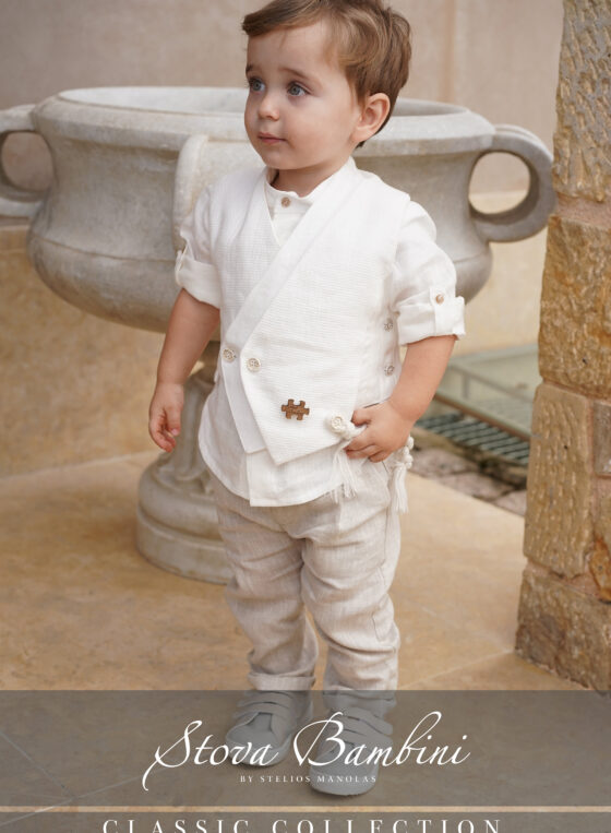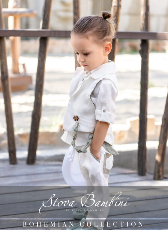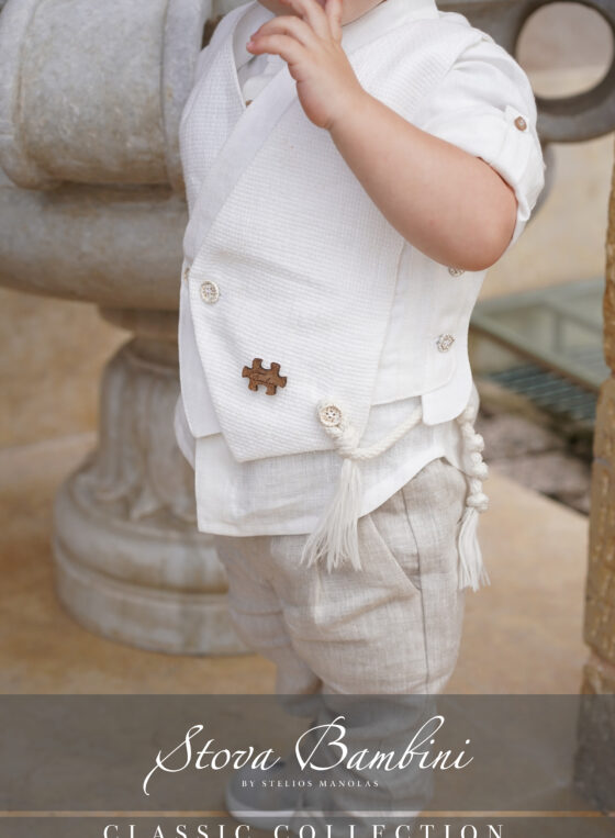 Λινό σύνολο βάπτισης 6 τεμαχίων, σε boho styleκαι απόχρωση μπεζ- off white, που περιλαμβάνει το νέο σχέδιο γιλέκου της Stova Bambini με ένα κούμπωμα και διακοσμητικό διπλό λινό στο ένα κομμάτι του γιλέκου με ανάγλυφη, ανάλαφρη ψάθα. Το παντελόνι είναι σε κλασσική γραμμή με μικρή πιέτα και διακοσμητικό τσεπάκι. Το πουκάμισο είναι λινό σε μάο γραμμή και ασορτί απόχρωση με το γιλέκο. Περιλαμβάνει καπέλο, γιλέκο, πουκάμισο, παντελόνι, ζώνη και διακοσμητικό bohemian αξεσουάρ στο γιλέκο. Συνδυάζεται με ανατομικά παπούτσια από το ύφασμα του ρούχου. Σχεδιάστε τη βάπτιση των ονείρων σας, κάθε ρούχο συνδυάζεται με ανάλογο φιόγκο για το κουτί ή την βαλίτσα σας, λαμπάδα, λαδόπανα, εσώρουχα, πετσέτες και σετ κολυμπήθρας (κεράκια-σαπούνι-μπουκάλι λαδιού), είτε διακοσμημένο και με το θέμα της επιλογής σας. Διατίθεται μεγεθολόγιο Stova Bambini σε όλα τα καταστήματα. Όλη η συλλογή σχεδιάζεται και κατασκευάζεται στην Ελλάδα. Διαθέσιμα μεγέθη: 6-9 μηνών, 9-12 μηνών, 12-18 μηνών, 18-24 μηνών, 24-36 και κατά παραγγελία μεγαλύτερα μεγέθη.