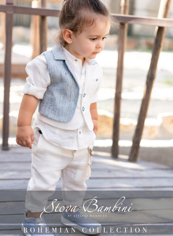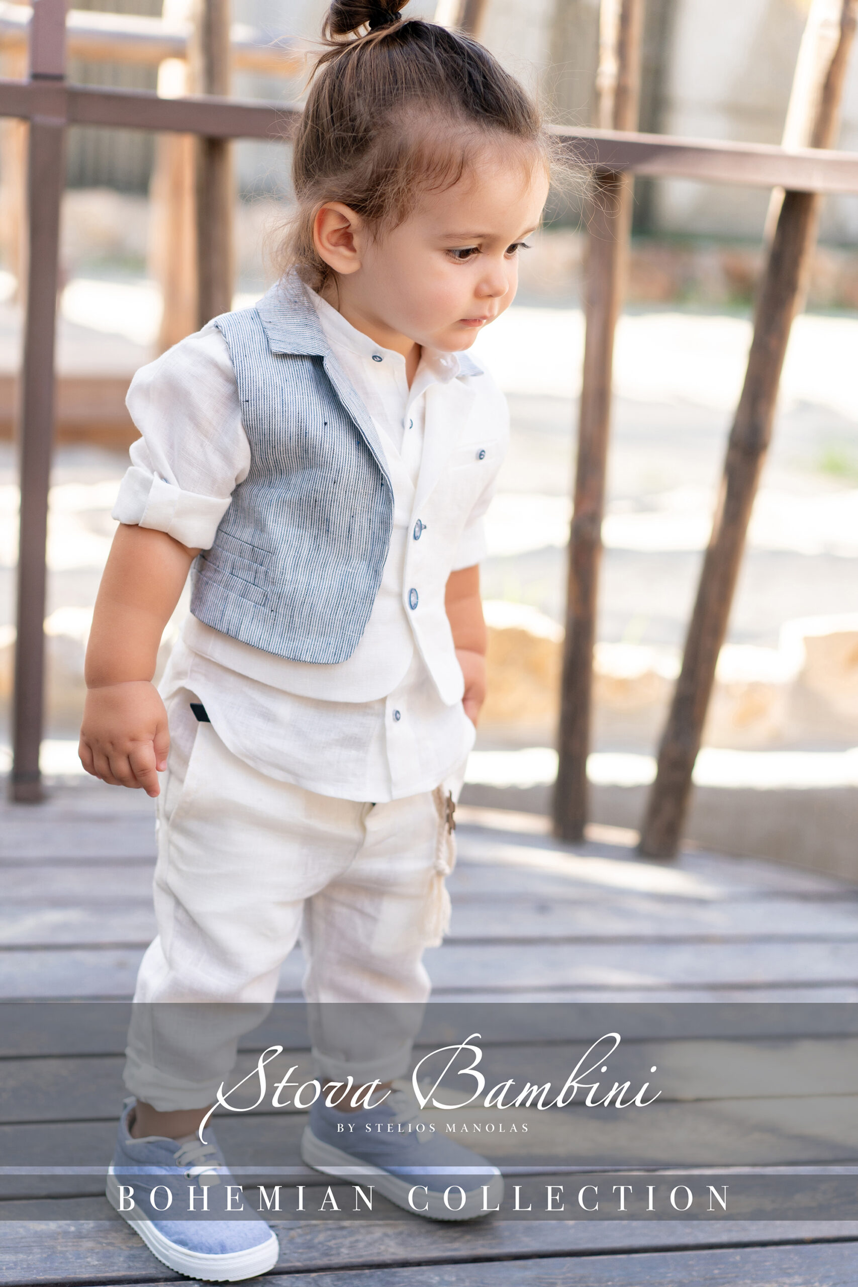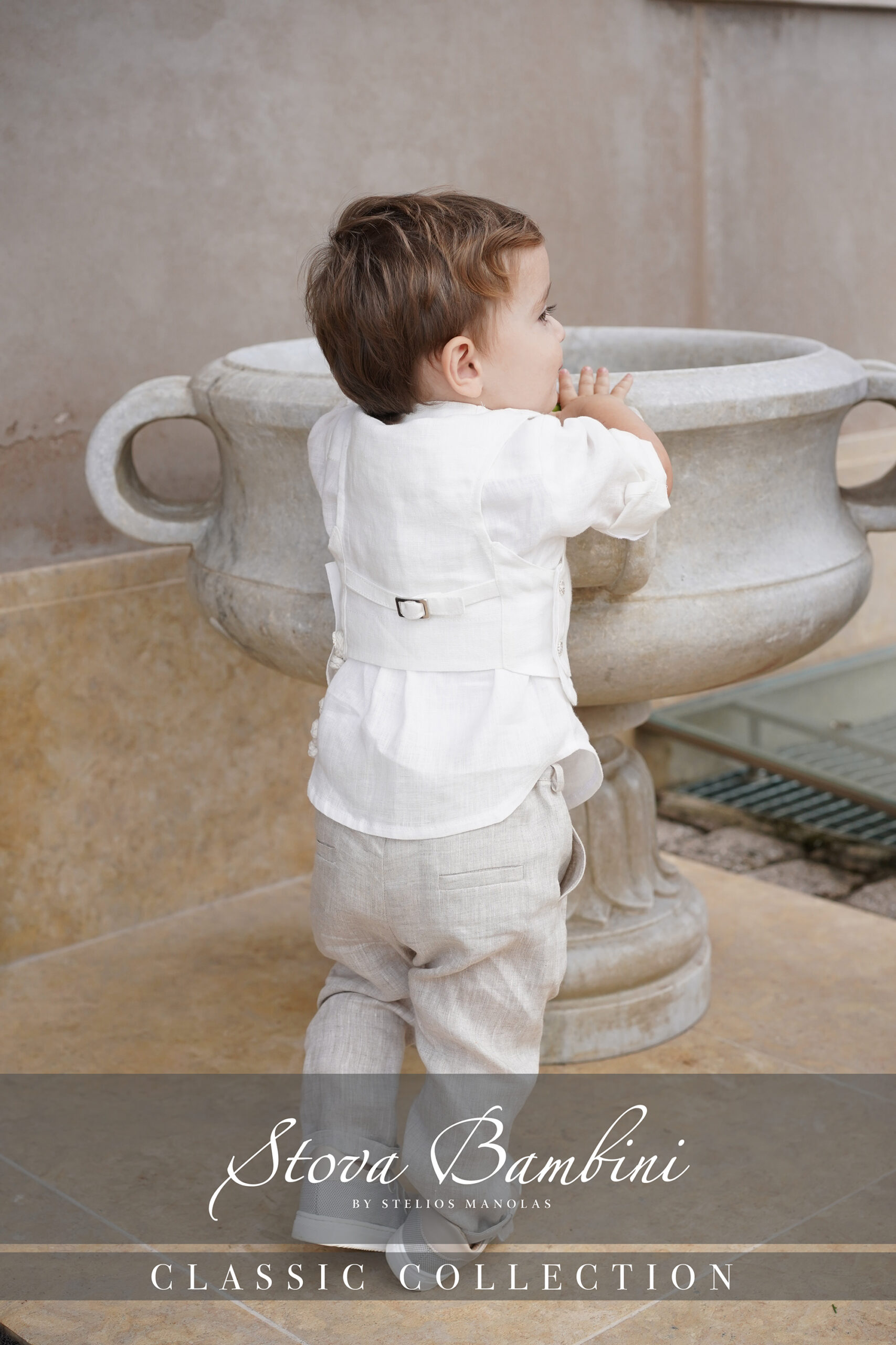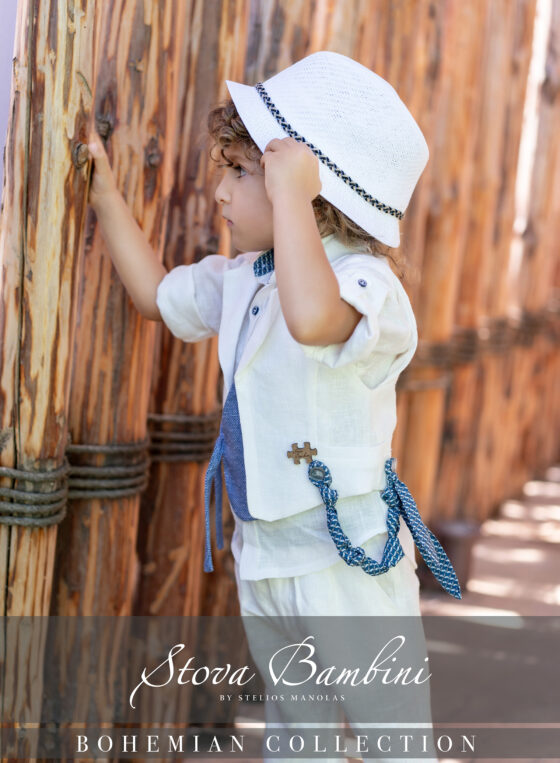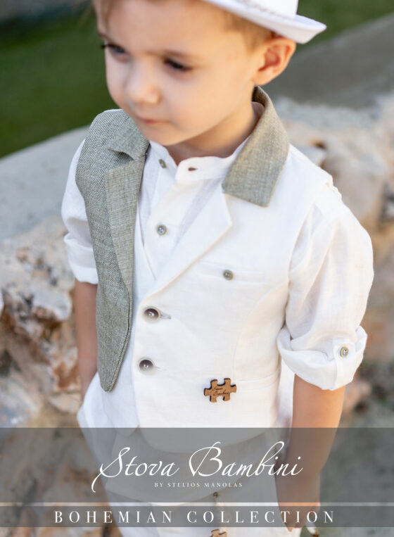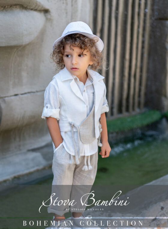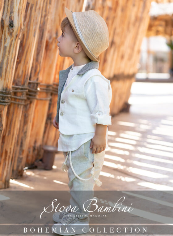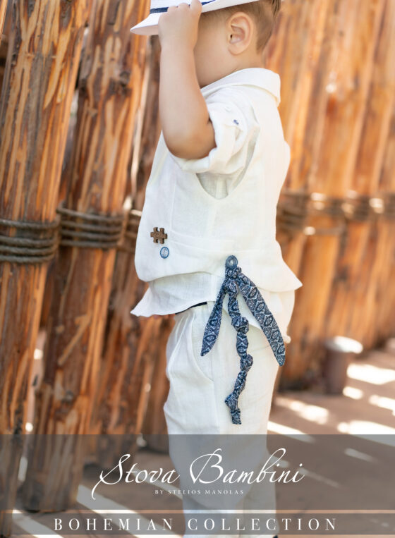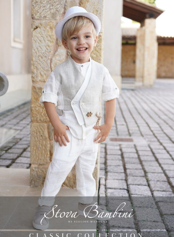 Λινό σύνολο βάπτισης 6 τεμαχίων, σε boho styleκαι απόχρωση μπεζ- off white, που περιλαμβάνει το νέο σχέδιο γιλέκου της Stova Bambini με ένα κούμπωμα και διακοσμητικό διπλό λινό στο ένα κομμάτι του γιλέκου με ανάγλυφη, ανάλαφρη ψάθα. Το παντελόνι είναι σε κλασσική γραμμή με μικρή πιέτα και διακοσμητικό τσεπάκι. Το πουκάμισο είναι λινό σε μάο γραμμή και ασορτί απόχρωση με το γιλέκο. Περιλαμβάνει καπέλο, γιλέκο, πουκάμισο, παντελόνι, ζώνη και διακοσμητικό bohemian αξεσουάρ στο γιλέκο. Συνδυάζεται με ανατομικά παπούτσια από το ύφασμα του ρούχου. Σχεδιάστε τη βάπτιση των ονείρων σας, κάθε ρούχο συνδυάζεται με ανάλογο φιόγκο για το κουτί ή την βαλίτσα σας, λαμπάδα, λαδόπανα, εσώρουχα, πετσέτες και σετ κολυμπήθρας (κεράκια-σαπούνι-μπουκάλι λαδιού), είτε διακοσμημένο και με το θέμα της επιλογής σας. Διατίθεται μεγεθολόγιο Stova Bambini σε όλα τα καταστήματα. Όλη η συλλογή σχεδιάζεται και κατασκευάζεται στην Ελλάδα. Διαθέσιμα μεγέθη: 6-9 μηνών, 9-12 μηνών, 12-18 μηνών, 18-24 μηνών, 24-36 και κατά παραγγελία μεγαλύτερα μεγέθη.