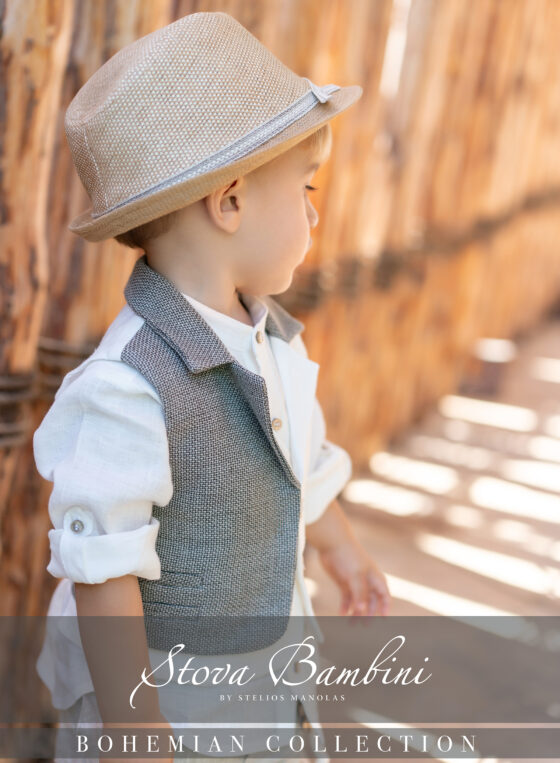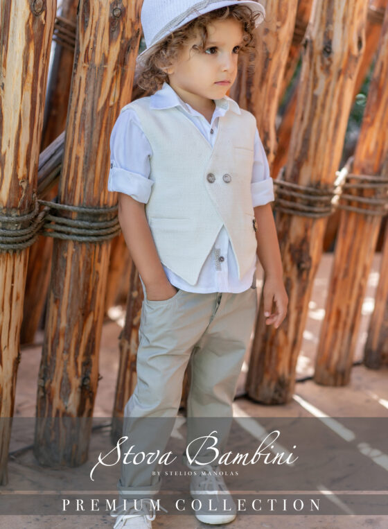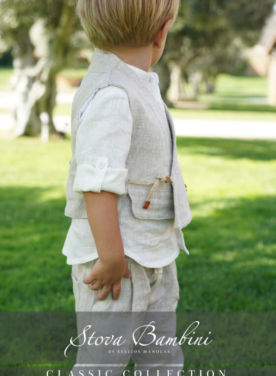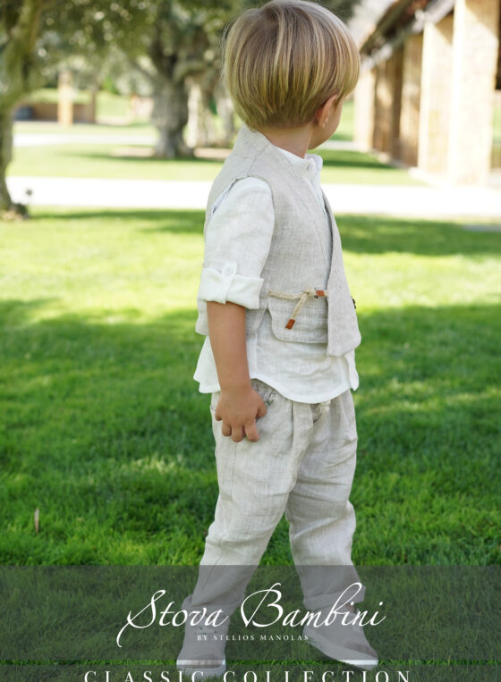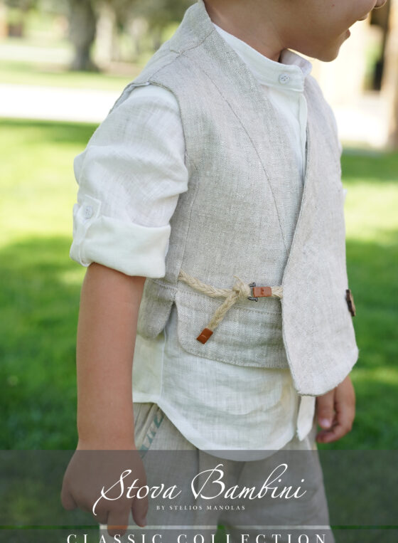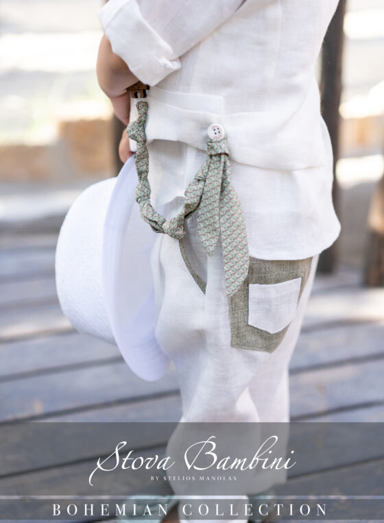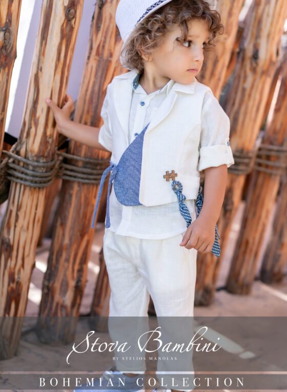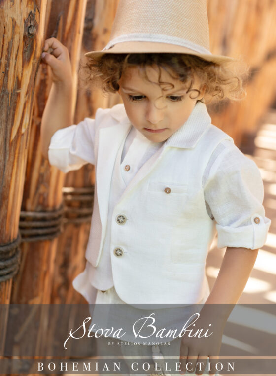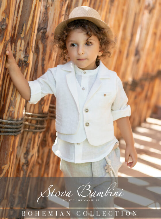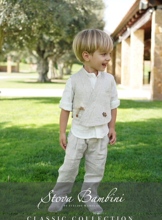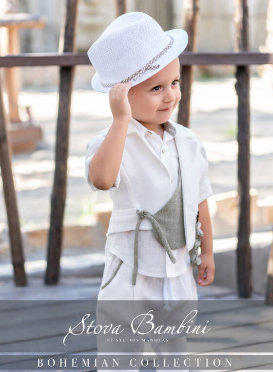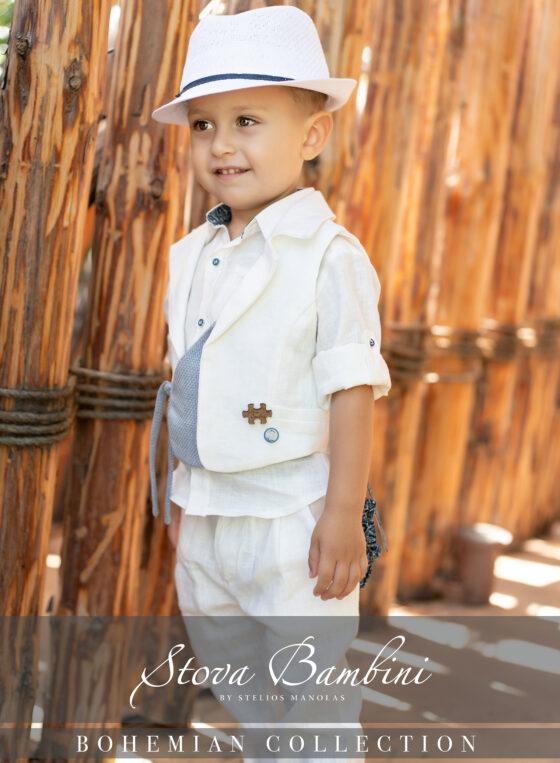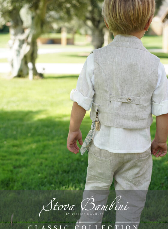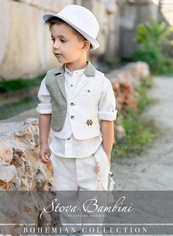 Λινό σύνολο βάπτισης 6 τεμαχίων, σε boho styleκαι απόχρωση μπεζ- off white, που περιλαμβάνει το νέο σχέδιο γιλέκου της Stova Bambini με ένα κούμπωμα και διακοσμητικό διπλό λινό στο ένα κομμάτι του γιλέκου με ανάγλυφη, ανάλαφρη ψάθα. Το παντελόνι είναι σε κλασσική γραμμή με μικρή πιέτα και διακοσμητικό τσεπάκι. Το πουκάμισο είναι λινό σε μάο γραμμή και ασορτί απόχρωση με το γιλέκο. Περιλαμβάνει καπέλο, γιλέκο, πουκάμισο, παντελόνι, ζώνη και διακοσμητικό bohemian αξεσουάρ στο γιλέκο. Συνδυάζεται με ανατομικά παπούτσια από το ύφασμα του ρούχου. Σχεδιάστε τη βάπτιση των ονείρων σας, κάθε ρούχο συνδυάζεται με ανάλογο φιόγκο για το κουτί ή την βαλίτσα σας, λαμπάδα, λαδόπανα, εσώρουχα, πετσέτες και σετ κολυμπήθρας (κεράκια-σαπούνι-μπουκάλι λαδιού), είτε διακοσμημένο και με το θέμα της επιλογής σας. Διατίθεται μεγεθολόγιο Stova Bambini σε όλα τα καταστήματα. Όλη η συλλογή σχεδιάζεται και κατασκευάζεται στην Ελλάδα. Διαθέσιμα μεγέθη: 6-9 μηνών, 9-12 μηνών, 12-18 μηνών, 18-24 μηνών, 24-36 και κατά παραγγελία μεγαλύτερα μεγέθη.