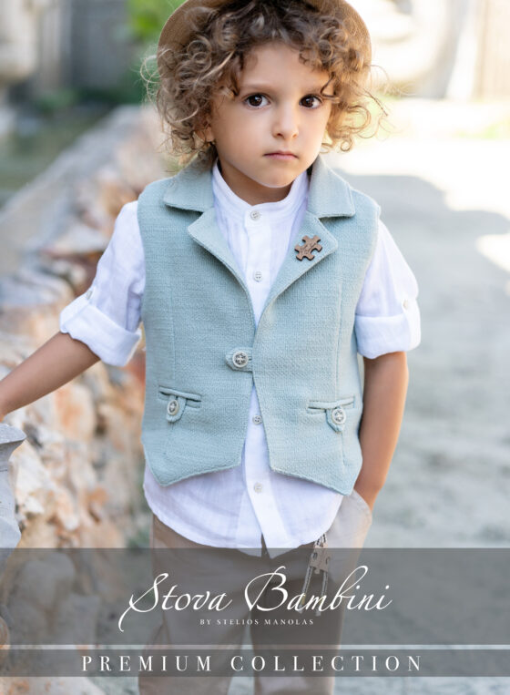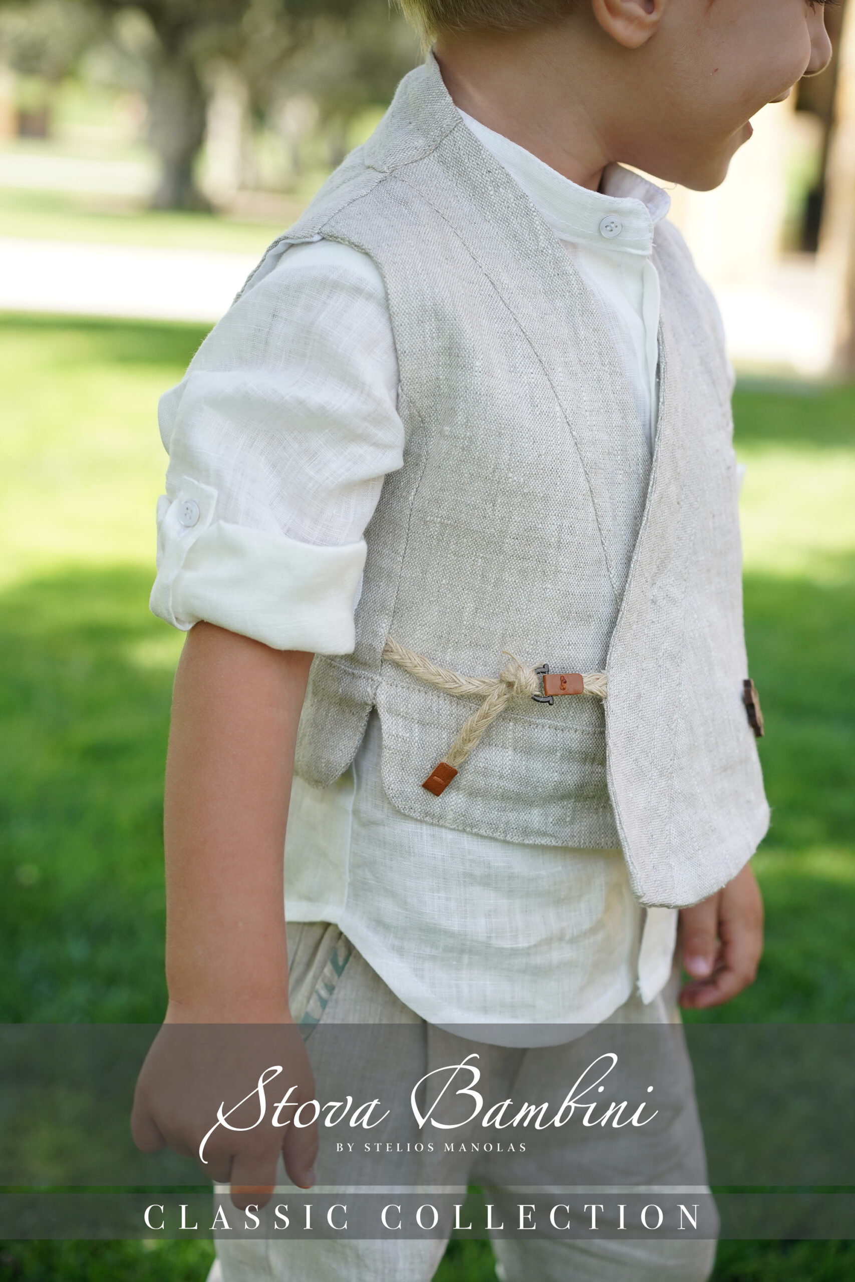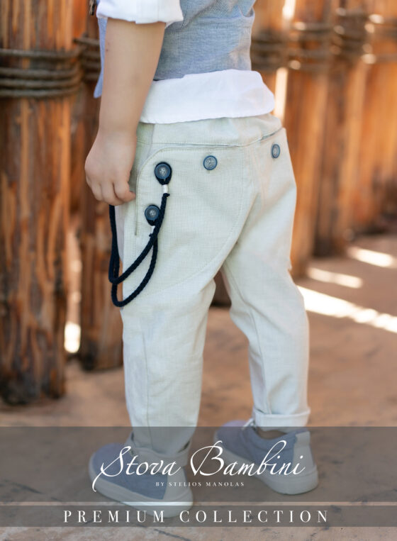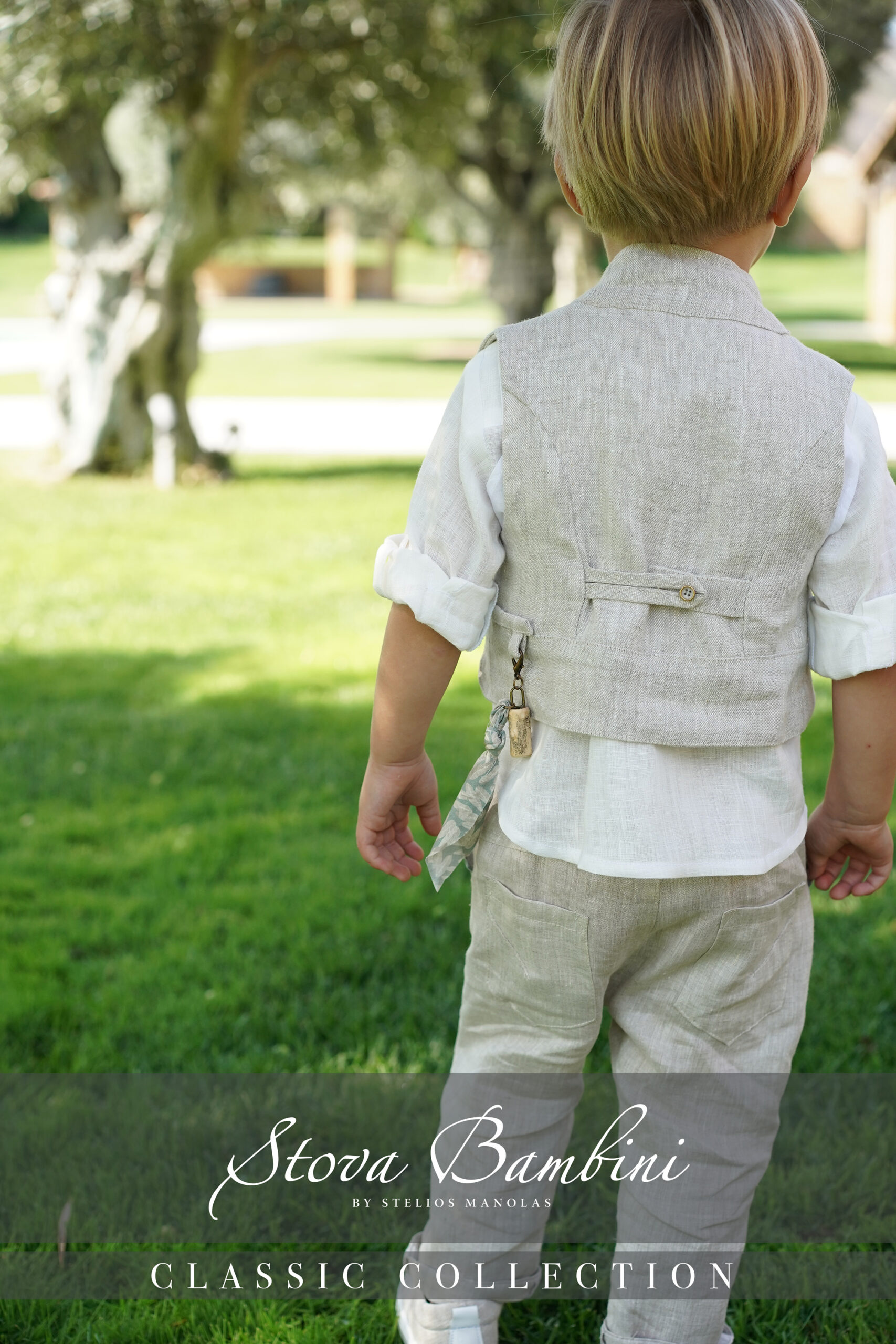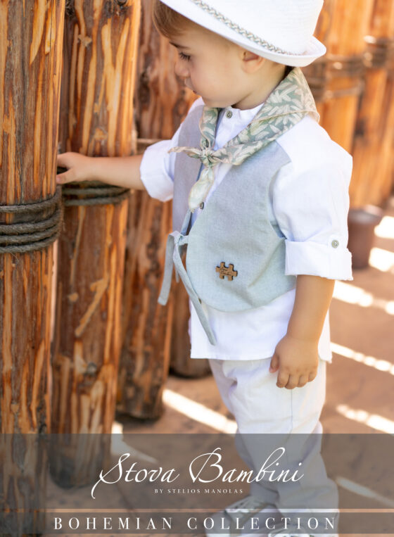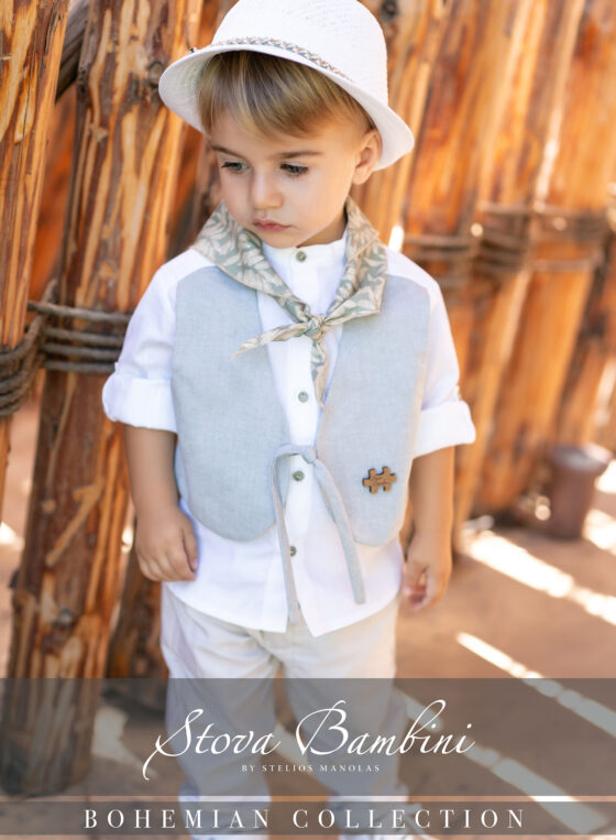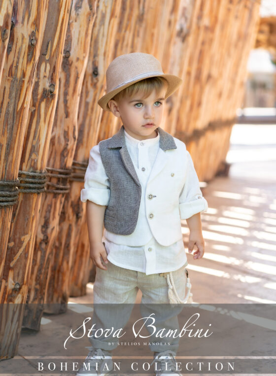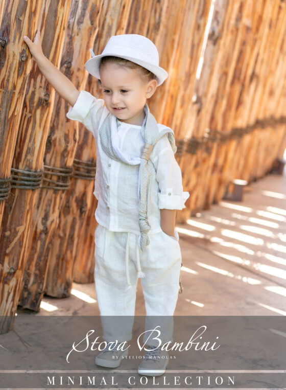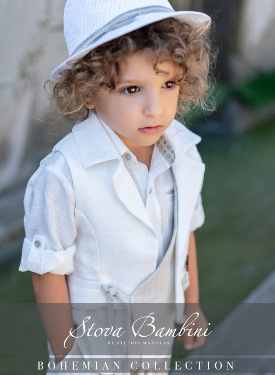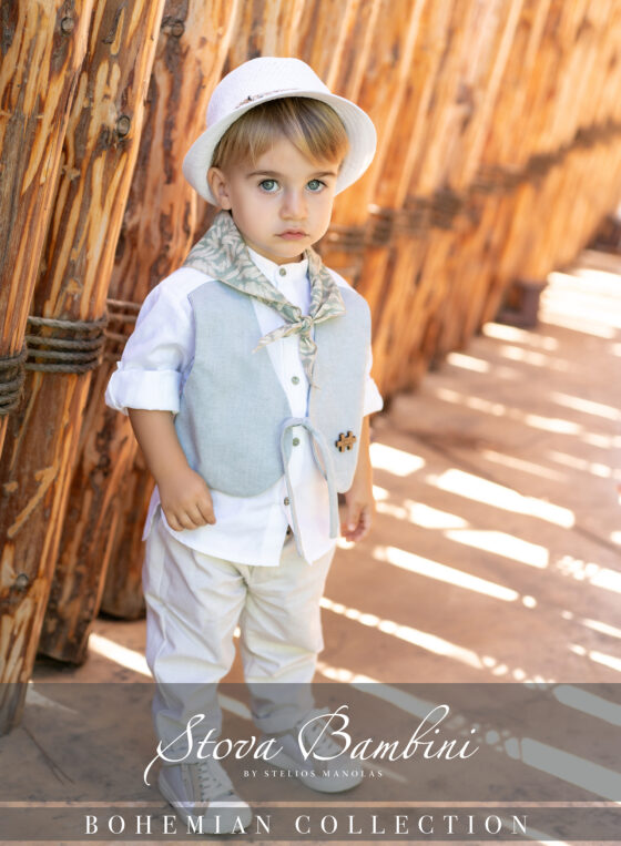Λινό σύνολο βάπτισης 6 τεμαχίων, σε boho styleκαι απόχρωση μπεζ- off white, που περιλαμβάνει το νέο σχέδιο γιλέκου της Stova Bambini με ένα κούμπωμα και διακοσμητικό διπλό λινό στο ένα κομμάτι του γιλέκου με ανάγλυφη, ανάλαφρη ψάθα. Το παντελόνι είναι σε κλασσική γραμμή με μικρή πιέτα και διακοσμητικό τσεπάκι. Το πουκάμισο είναι λινό σε μάο γραμμή και ασορτί απόχρωση με το γιλέκο. Περιλαμβάνει καπέλο, γιλέκο, πουκάμισο, παντελόνι, ζώνη και διακοσμητικό bohemian αξεσουάρ στο γιλέκο. Συνδυάζεται με ανατομικά παπούτσια από το ύφασμα του ρούχου. Σχεδιάστε τη βάπτιση των ονείρων σας, κάθε ρούχο συνδυάζεται με ανάλογο φιόγκο για το κουτί ή την βαλίτσα σας, λαμπάδα, λαδόπανα, εσώρουχα, πετσέτες και σετ κολυμπήθρας (κεράκια-σαπούνι-μπουκάλι λαδιού), είτε διακοσμημένο και με το θέμα της επιλογής σας. Διατίθεται μεγεθολόγιο Stova Bambini σε όλα τα καταστήματα. Όλη η συλλογή σχεδιάζεται και κατασκευάζεται στην Ελλάδα. Διαθέσιμα μεγέθη: 6-9 μηνών, 9-12 μηνών, 12-18 μηνών, 18-24 μηνών, 24-36 και κατά παραγγελία μεγαλύτερα μεγέθη.