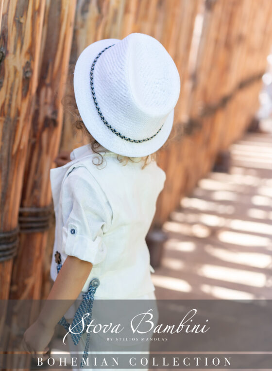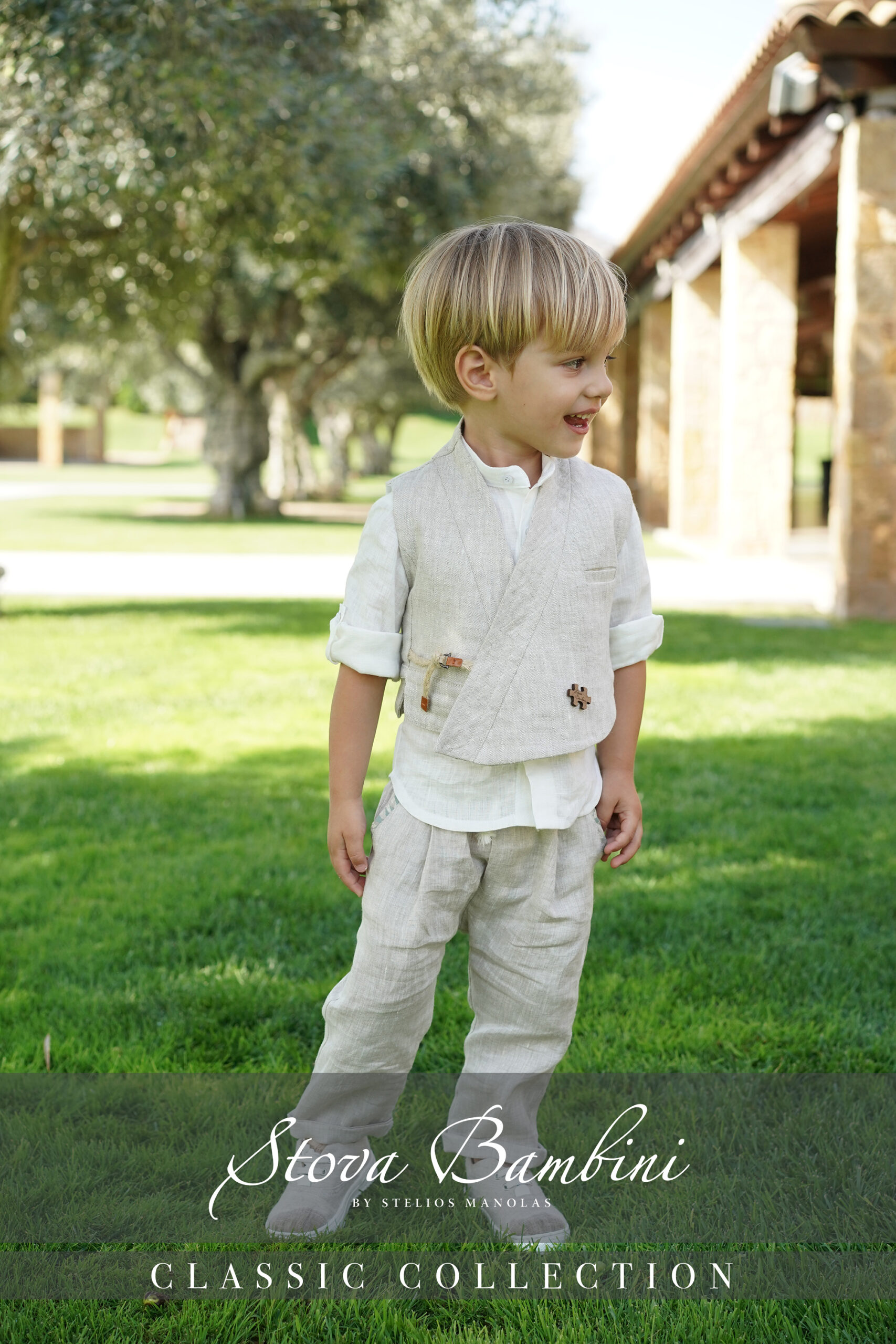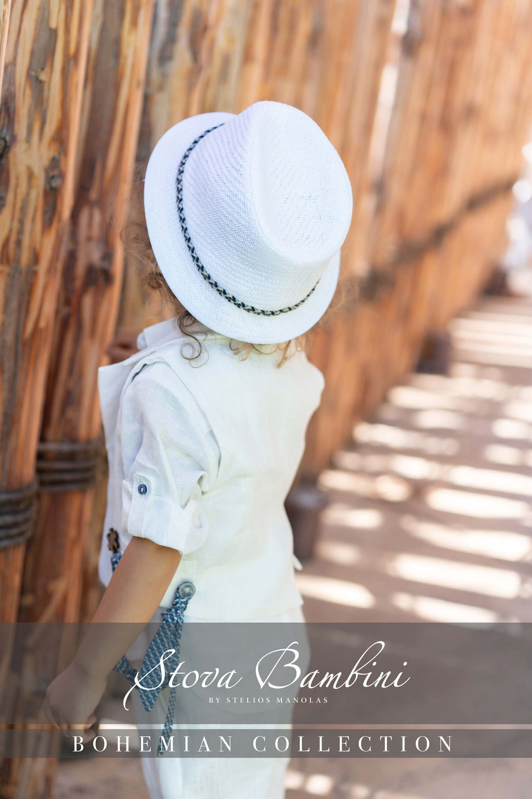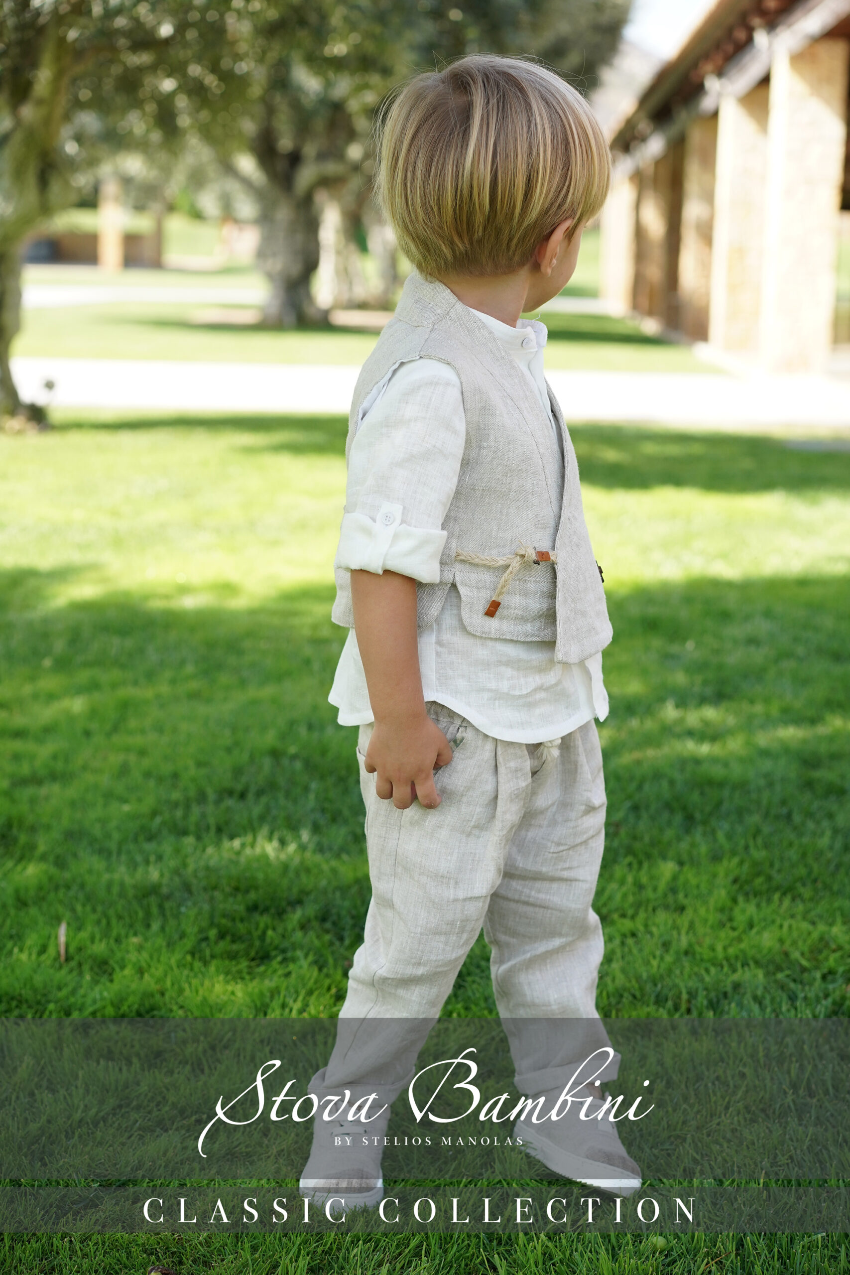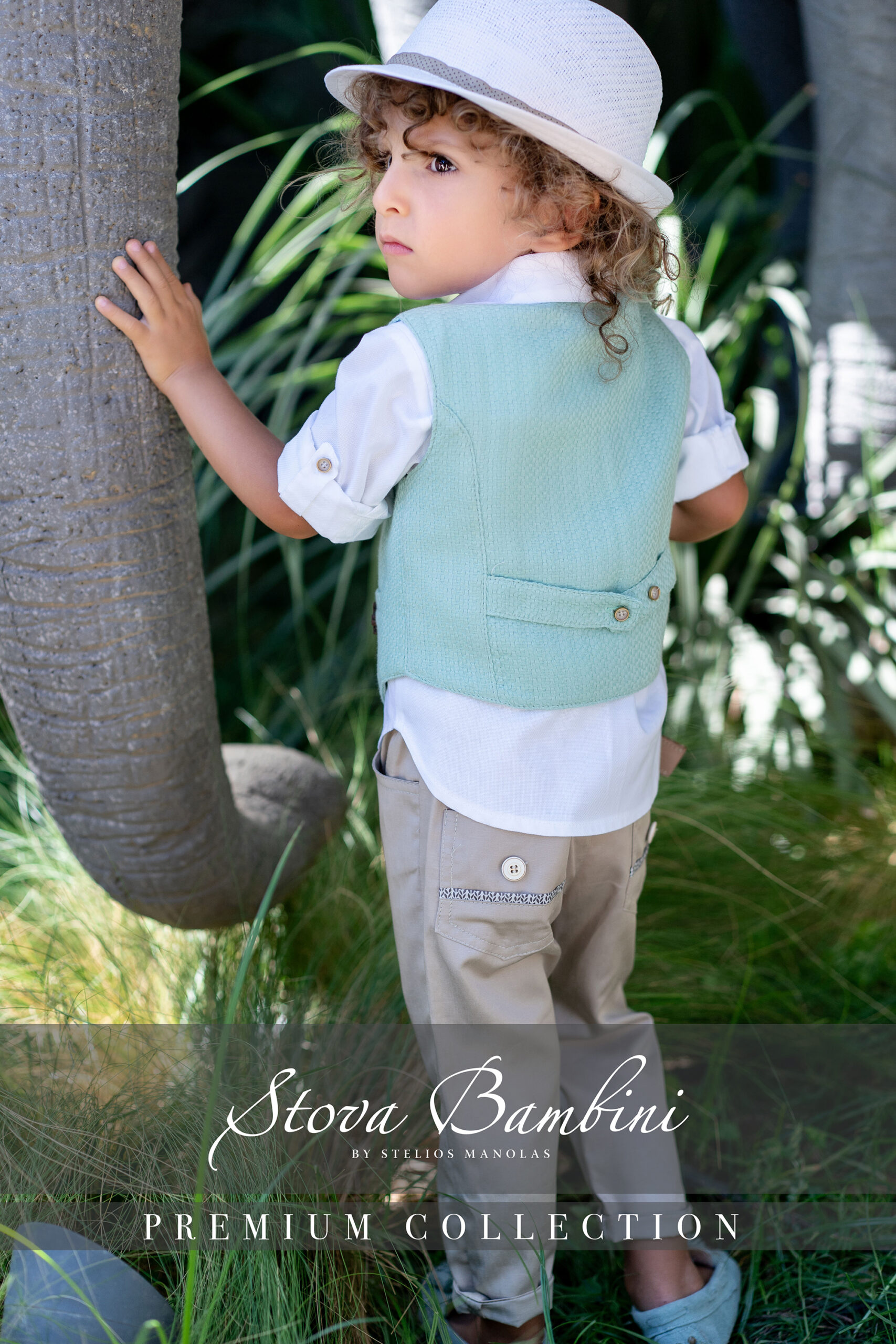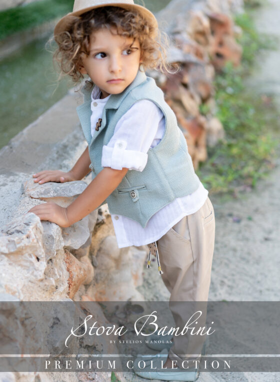 Λινό σύνολο βάπτισης 6 τεμαχίων, σε boho styleκαι απόχρωση μπεζ- off white, που περιλαμβάνει το νέο σχέδιο γιλέκου της Stova Bambini με ένα κούμπωμα και διακοσμητικό διπλό λινό στο ένα κομμάτι του γιλέκου με ανάγλυφη, ανάλαφρη ψάθα. Το παντελόνι είναι σε κλασσική γραμμή με μικρή πιέτα και διακοσμητικό τσεπάκι. Το πουκάμισο είναι λινό σε μάο γραμμή και ασορτί απόχρωση με το γιλέκο. Περιλαμβάνει καπέλο, γιλέκο, πουκάμισο, παντελόνι, ζώνη και διακοσμητικό bohemian αξεσουάρ στο γιλέκο. Συνδυάζεται με ανατομικά παπούτσια από το ύφασμα του ρούχου. Σχεδιάστε τη βάπτιση των ονείρων σας, κάθε ρούχο συνδυάζεται με ανάλογο φιόγκο για το κουτί ή την βαλίτσα σας, λαμπάδα, λαδόπανα, εσώρουχα, πετσέτες και σετ κολυμπήθρας (κεράκια-σαπούνι-μπουκάλι λαδιού), είτε διακοσμημένο και με το θέμα της επιλογής σας. Διατίθεται μεγεθολόγιο Stova Bambini σε όλα τα καταστήματα. Όλη η συλλογή σχεδιάζεται και κατασκευάζεται στην Ελλάδα. Διαθέσιμα μεγέθη: 6-9 μηνών, 9-12 μηνών, 12-18 μηνών, 18-24 μηνών, 24-36 και κατά παραγγελία μεγαλύτερα μεγέθη.
