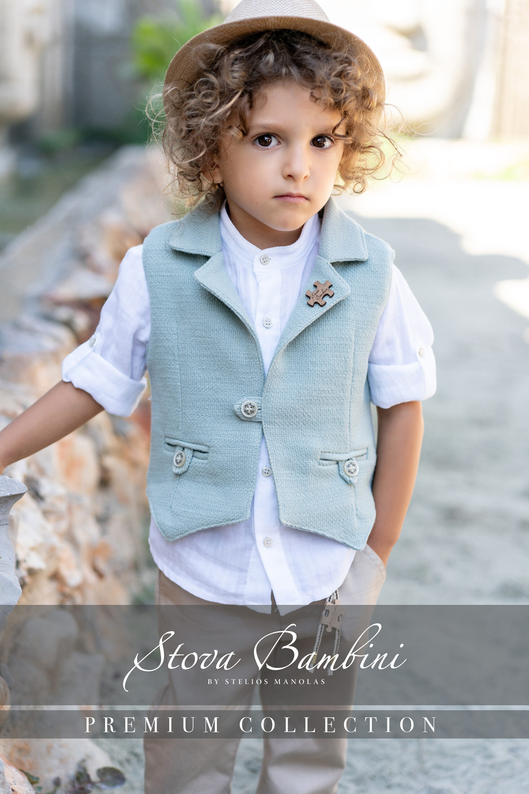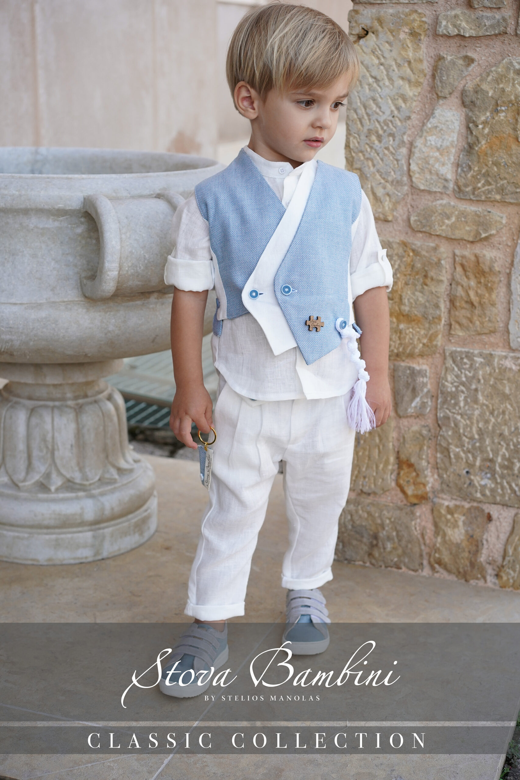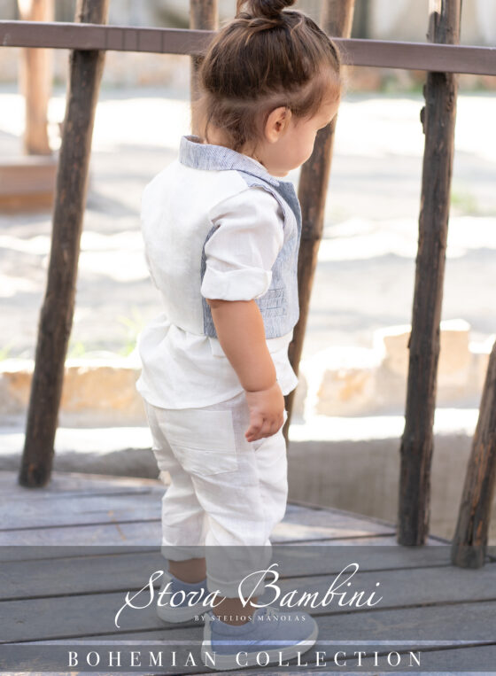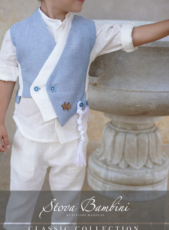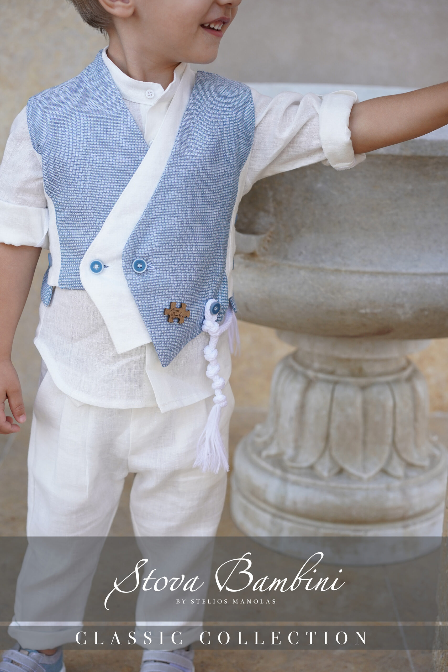 Λινό σύνολο βάπτισης 6 τεμαχίων, σε boho styleκαι απόχρωση off white - σιέλ, που περιλαμβάνει το νέο σχέδιο γιλέκου της Stova Bambini με ένα κούμπωμα και διακοσμητικό διπλό λινό στο ένα κομμάτι του γιλέκου με ανάγλυφη, ανάλαφρη ψάθα. Το παντελόνι είναι σε κλασσική γραμμή με μικρή πιέτα και διακοσμητικό τσεπάκι. Το πουκάμισο είναι λινό σε μάο γραμμή και ασορτί απόχρωση με το παντελόνι. Περιλαμβάνει καπέλο, γιλέκο, πουκάμισο, παντελόνι, ζώνη και διακοσμητικό bohemian αξεσουάρ στο γιλέκο. Συνδυάζεται με ανατομικά παπούτσια από το ύφασμα του ρούχου. Σχεδιάστε τη βάπτιση των ονείρων σας, κάθε ρούχο συνδυάζεται με ανάλογο φιόγκο για το κουτί ή την βαλίτσα σας, λαμπάδα, λαδόπανα, εσώρουχα, πετσέτες και σετ κολυμπήθρας (κεράκια-σαπούνι-μπουκάλι λαδιού), είτε διακοσμημένο και με το θέμα της επιλογής σας. Διατίθεται μεγεθολόγιο. Stova Bambini σε όλα τα καταστήματα. Όλη η συλλογή σχεδιάζεται και κατασκευάζεται στην Ελλάδα. Διαθέσιμα μεγέθη: 6-9 μηνών, 9-12 μηνών, 12-18 μηνών, 18-24 μηνών, 24-36 και κατά παραγγελία μεγαλύτερα μεγέθη.
