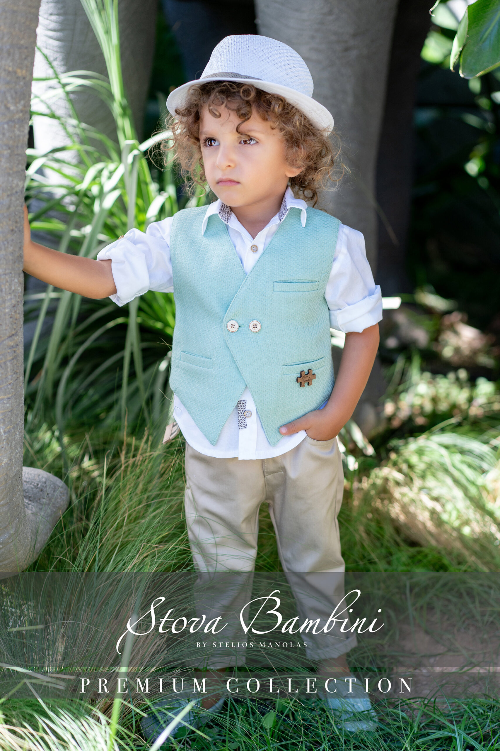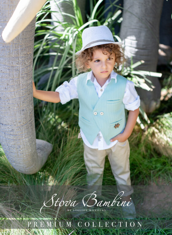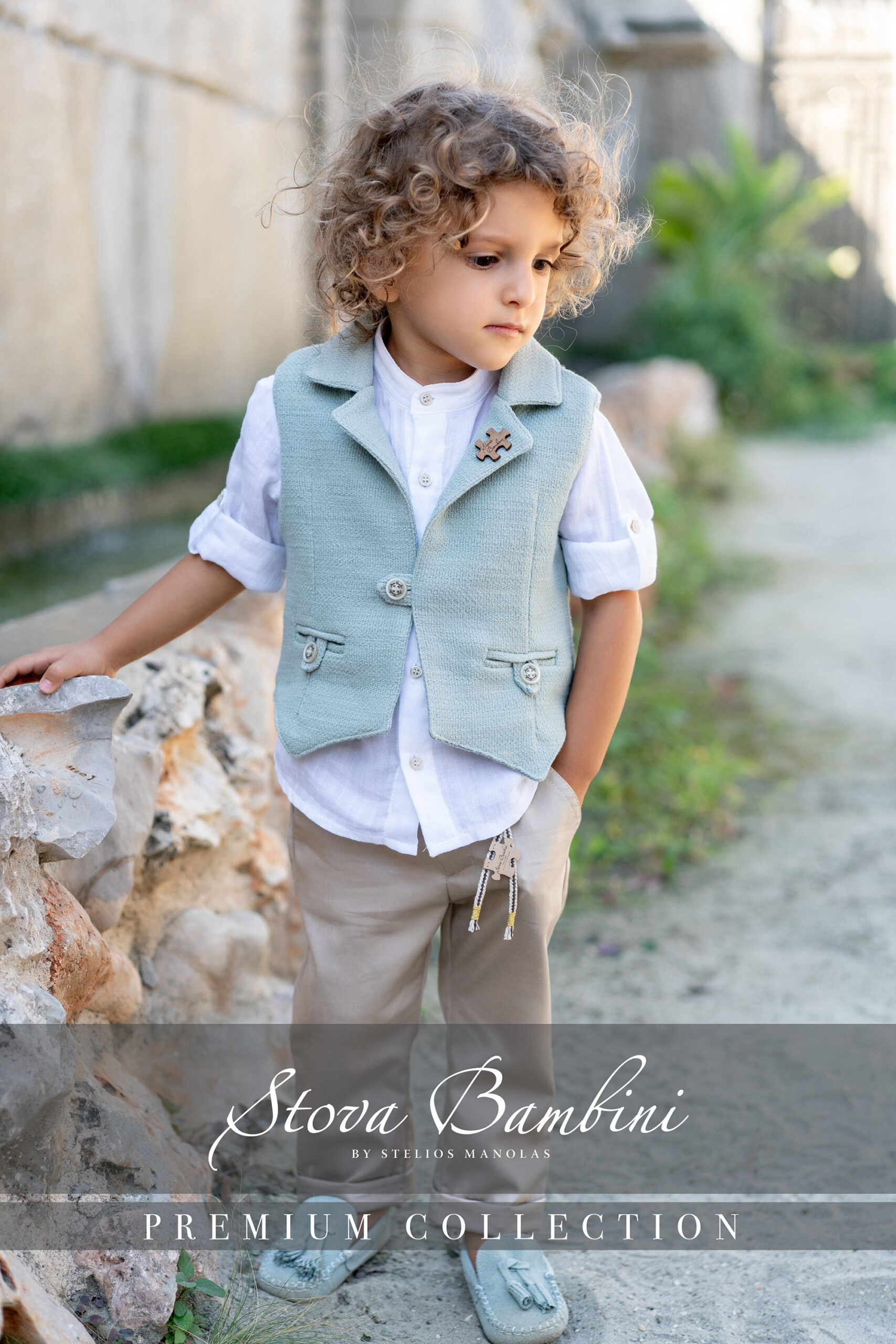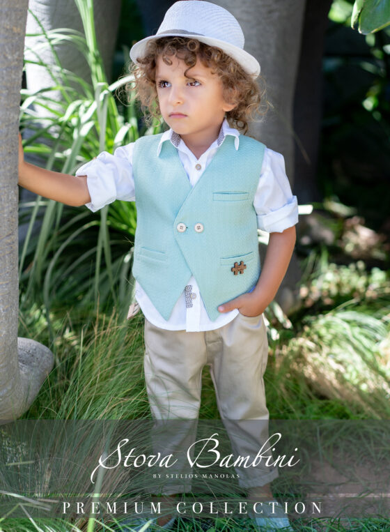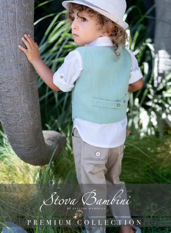 Λινό σύνολο βάπτισης 6 τεμαχίων, σε boho styleκαι απόχρωση off white - σιέλ, που περιλαμβάνει το νέο σχέδιο γιλέκου της Stova Bambini με ένα κούμπωμα και διακοσμητικό διπλό λινό στο ένα κομμάτι του γιλέκου με ανάγλυφη, ανάλαφρη ψάθα. Το παντελόνι είναι σε κλασσική γραμμή με μικρή πιέτα και διακοσμητικό τσεπάκι. Το πουκάμισο είναι λινό σε μάο γραμμή και ασορτί απόχρωση με το παντελόνι. Περιλαμβάνει καπέλο, γιλέκο, πουκάμισο, παντελόνι, ζώνη και διακοσμητικό bohemian αξεσουάρ στο γιλέκο. Συνδυάζεται με ανατομικά παπούτσια από το ύφασμα του ρούχου. Σχεδιάστε τη βάπτιση των ονείρων σας, κάθε ρούχο συνδυάζεται με ανάλογο φιόγκο για το κουτί ή την βαλίτσα σας, λαμπάδα, λαδόπανα, εσώρουχα, πετσέτες και σετ κολυμπήθρας (κεράκια-σαπούνι-μπουκάλι λαδιού), είτε διακοσμημένο και με το θέμα της επιλογής σας. Διατίθεται μεγεθολόγιο. Stova Bambini σε όλα τα καταστήματα. Όλη η συλλογή σχεδιάζεται και κατασκευάζεται στην Ελλάδα. Διαθέσιμα μεγέθη: 6-9 μηνών, 9-12 μηνών, 12-18 μηνών, 18-24 μηνών, 24-36 και κατά παραγγελία μεγαλύτερα μεγέθη.
