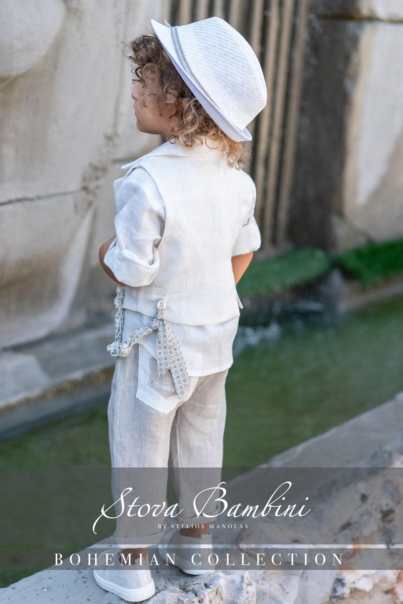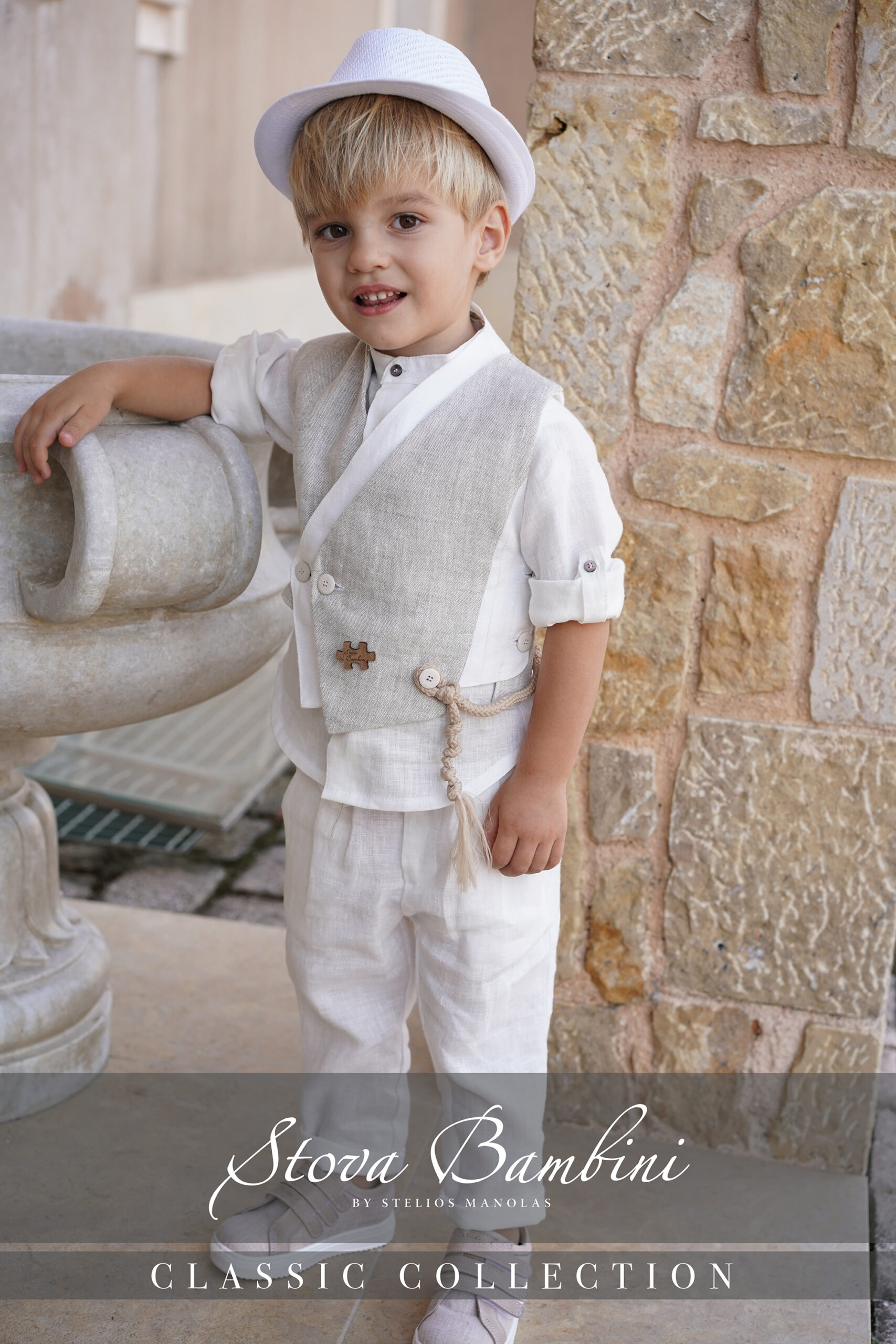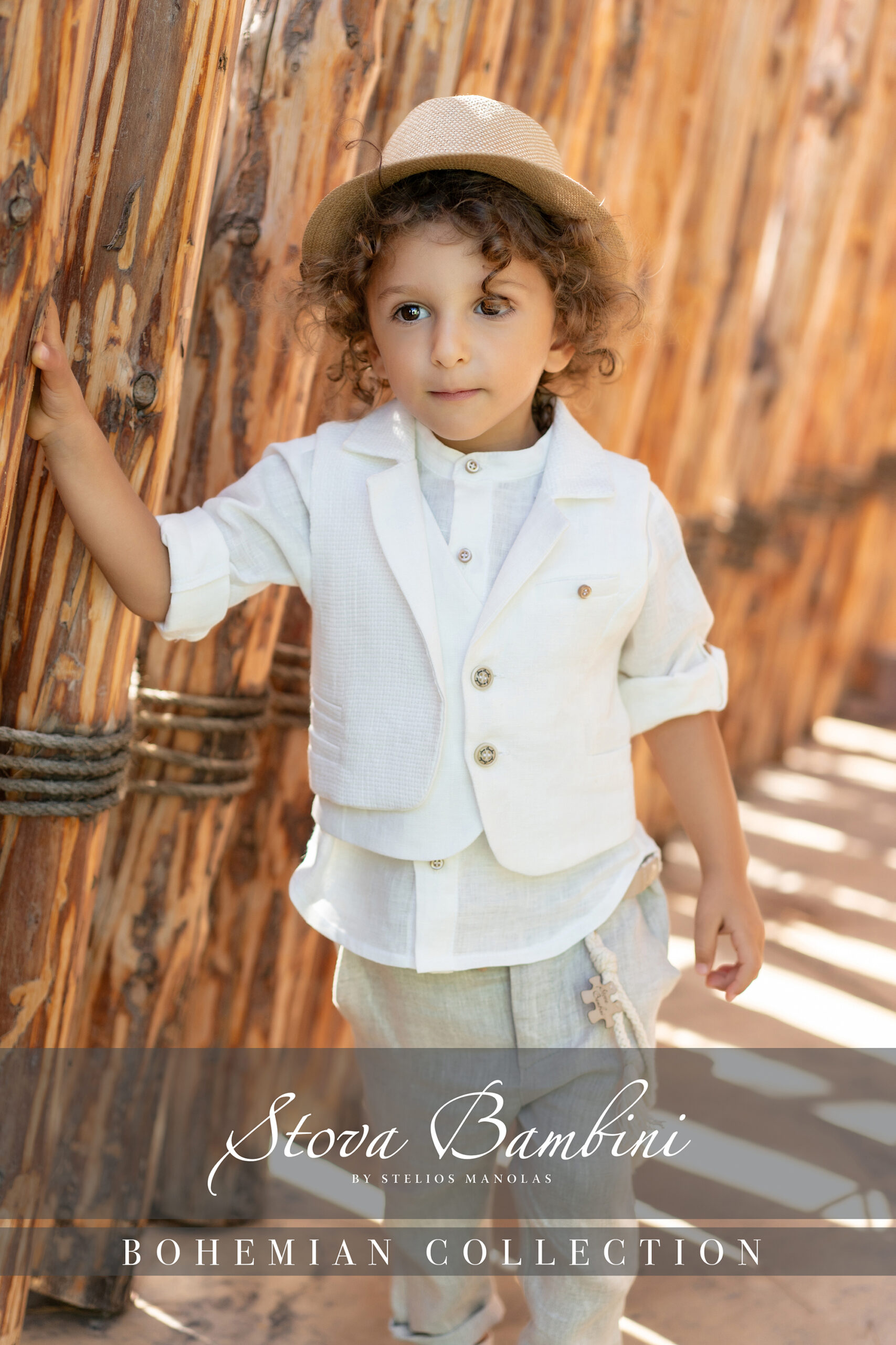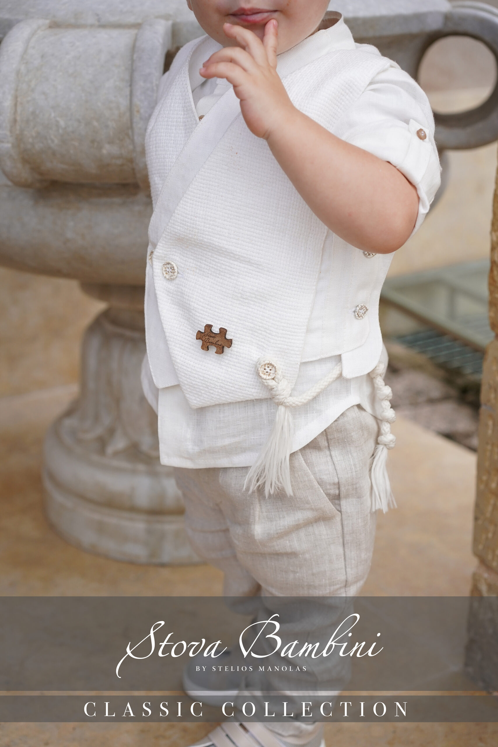Λινό σύνολο βάπτισης 6 τεμαχίων, σε boho style και απόχρωση off white - μπεζ, που περιλαμβάνει το νέο σχέδιο γιλέκου της Stova Bambini με ένα κούμπωμα και διακοσμητικό διπλό λινό στο ένα κομμάτι του γιλέκου με ανάγλυφη, ανάλαφρη ψάθα. Το παντελόνι είναι σε κλασσική γραμμή με μικρή πιέτα και διακοσμητικό τσεπάκι. Το πουκάμισο είναι λινό σε μάο γραμμή και ασορτί απόχρωση με το γιλέκο. Περιλαμβάνει καπέλο, γιλέκο, πουκάμισο, παντελόνι, ζώνη και διακοσμητικό bohemian αξεσουάρ στο γιλέκο. Συνδυάζεται με ανατομικά παπούτσια από το ύφασμα του ρούχου. Σχεδιάστε τη βάπτιση των ονείρων σας, κάθε ρούχο συνδυάζεται με ανάλογο φιόγκο για το κουτί ή την βαλίτσα σας, λαμπάδα, λαδόπανα, εσώρουχα, πετσέτες και σετ κολυμπήθρας (κεράκια-σαπούνι-μπουκάλι λαδιού), είτε διακοσμημένο και με το θέμα της επιλογής σας. Διατίθεται μεγεθολόγιο Stova Bambini σε όλα τα καταστήματα. Όλη η συλλογή σχεδιάζεται και κατασκευάζεται στην Ελλάδα. Διαθέσιμα μεγέθη: 6-9 μηνών, 9-12 μηνών, 12-18 μηνών, 18-24 μηνών, 24-36 και κατά παραγγελία μεγαλύτερα μεγέθη.