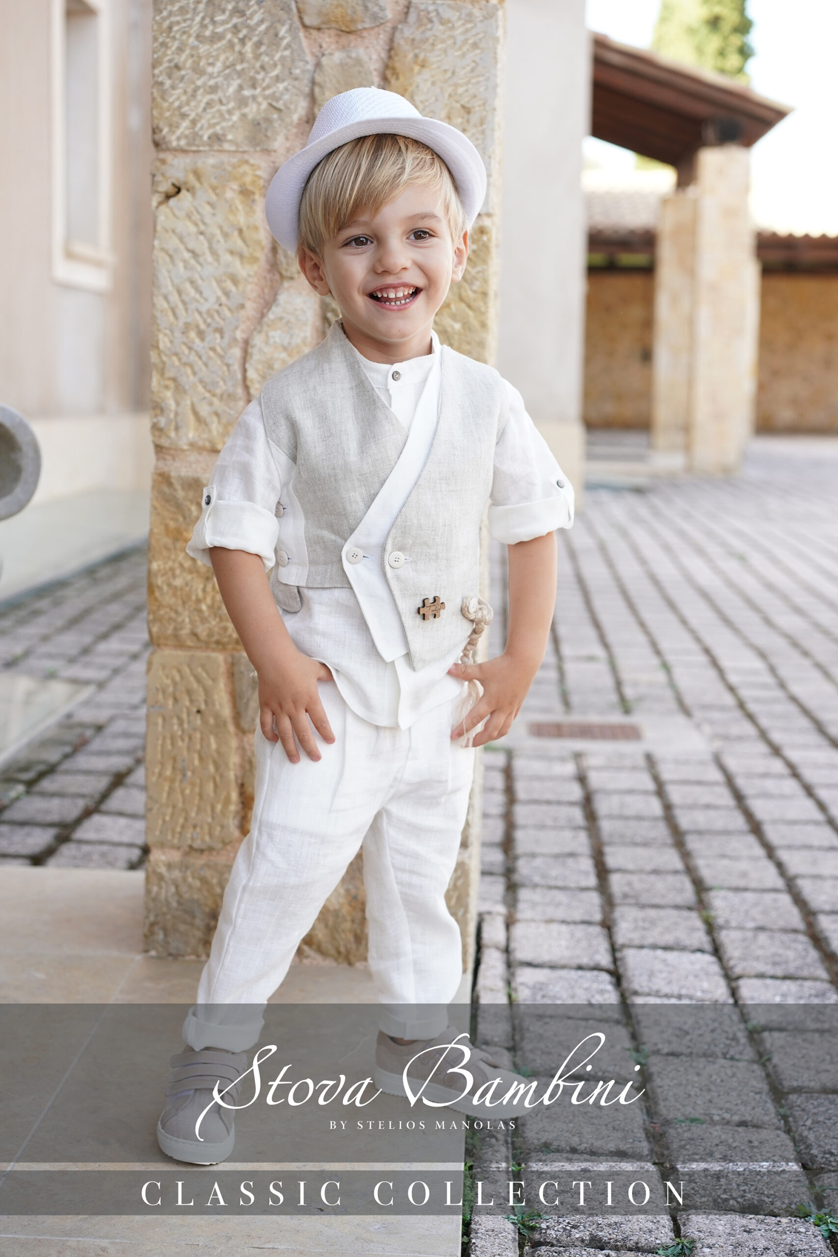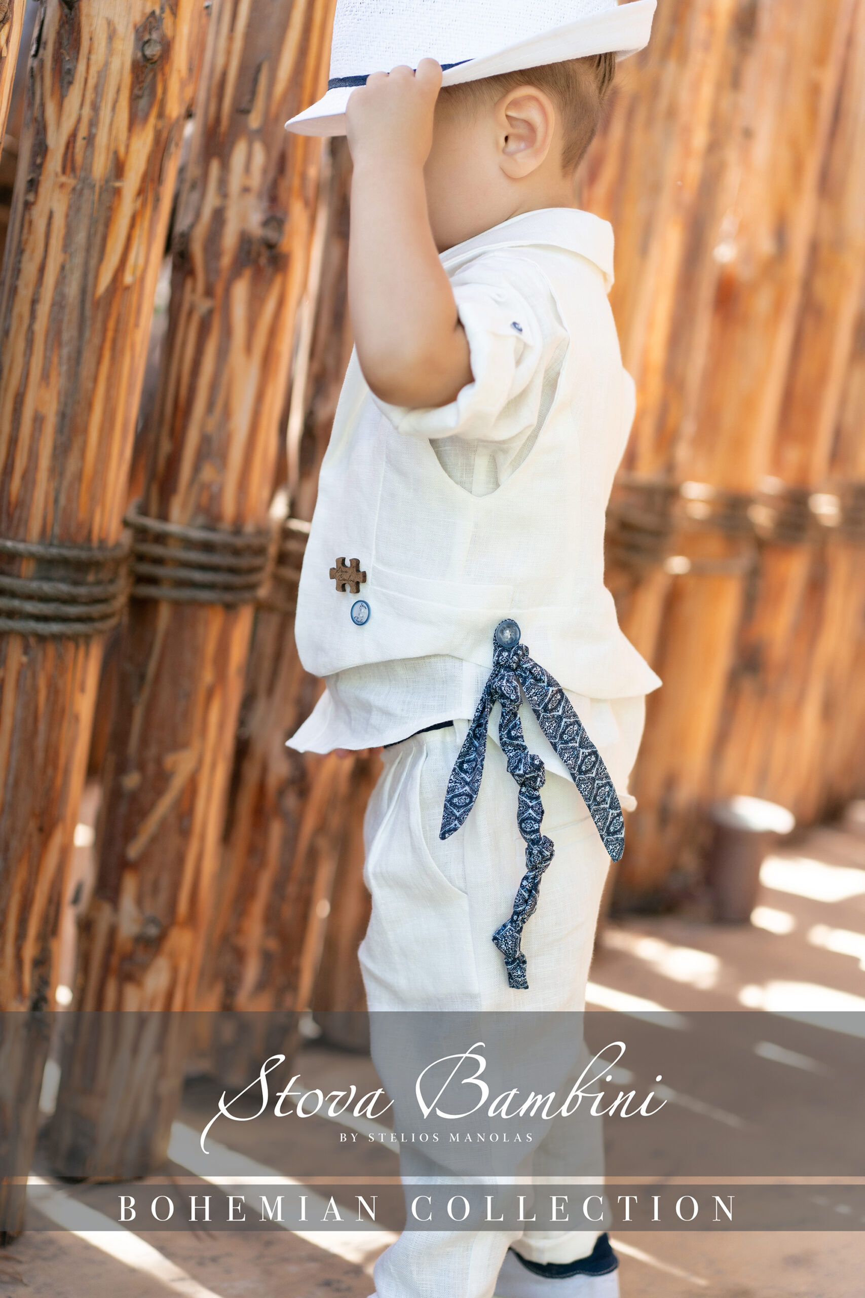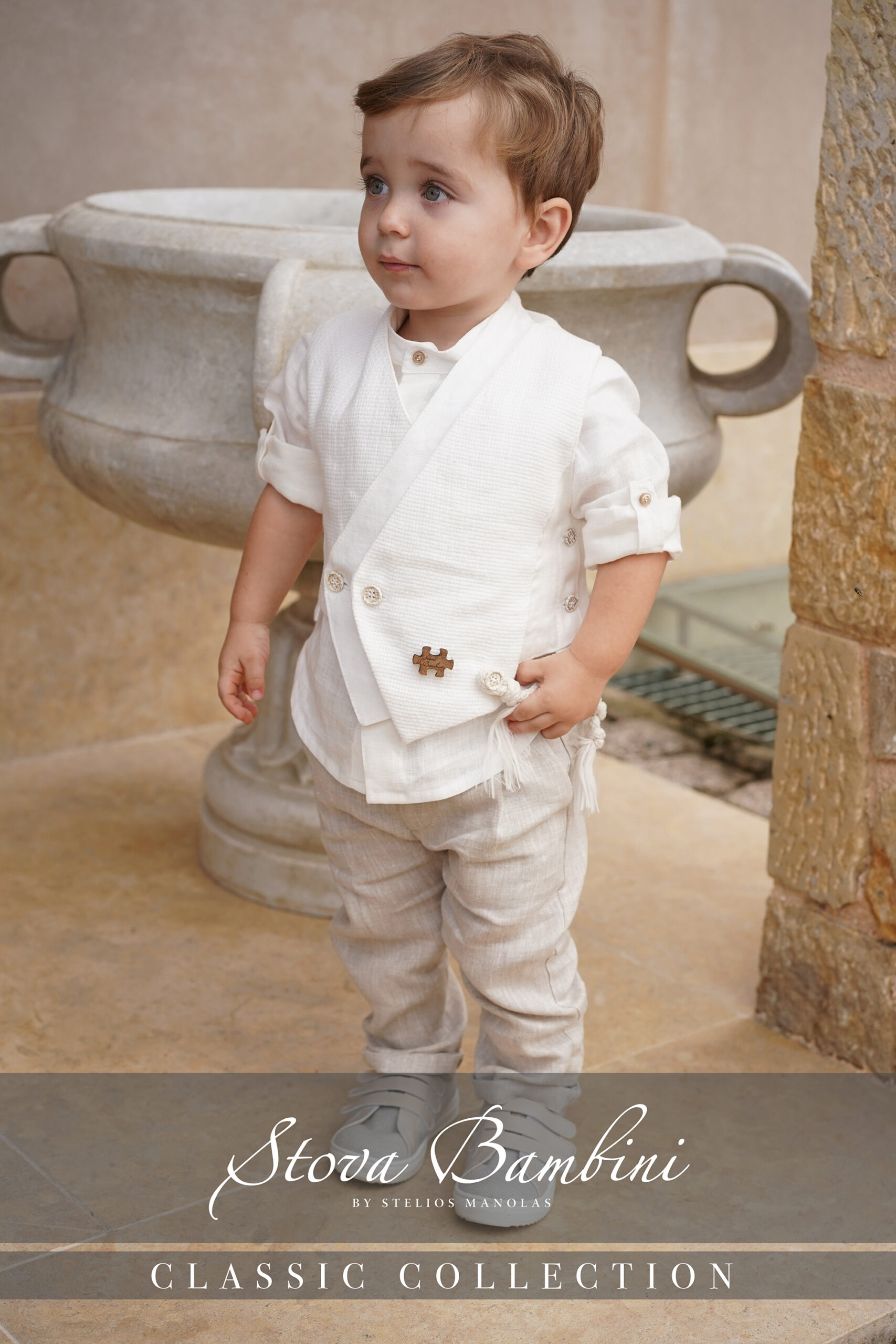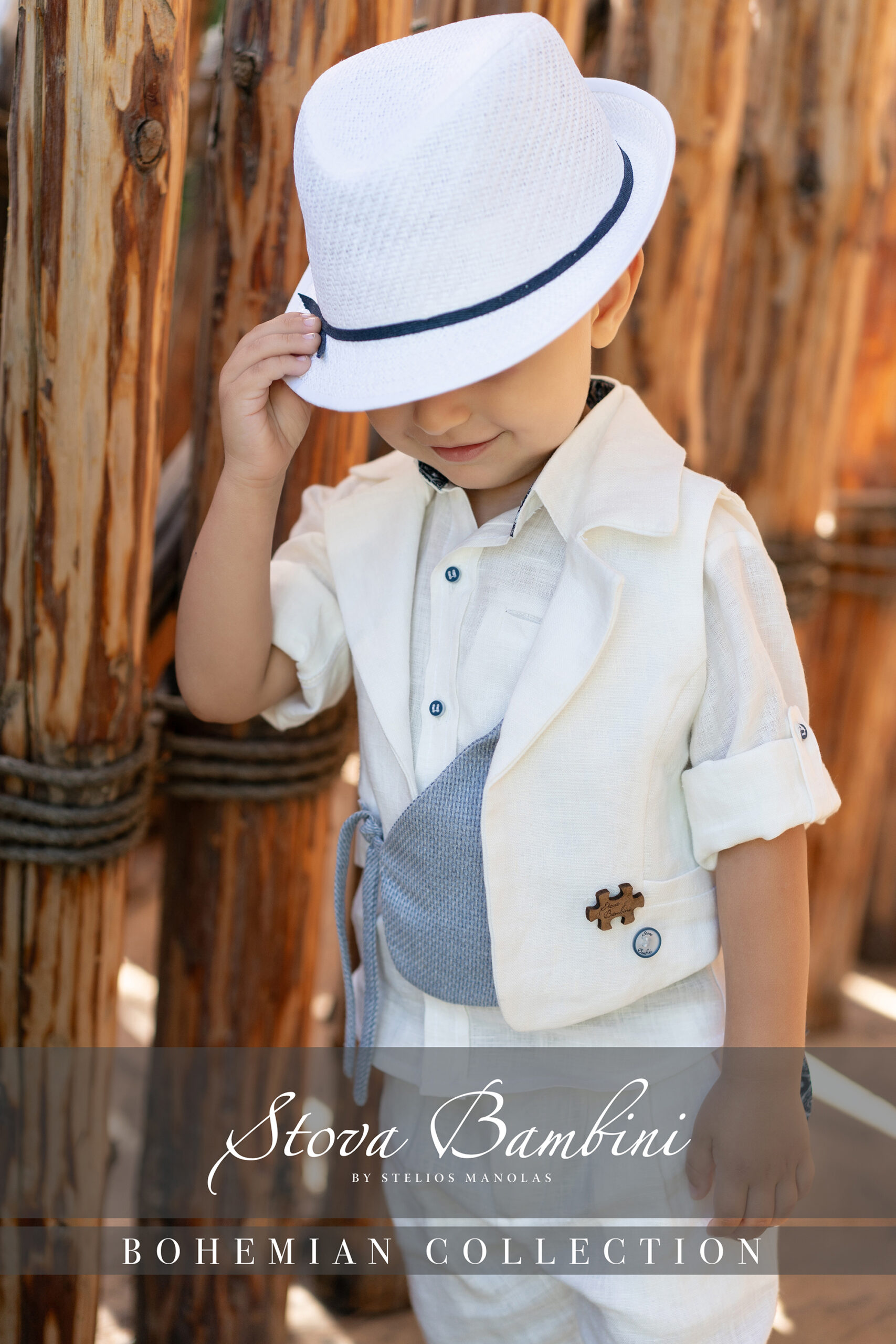 Λινό σύνολο βάπτισης 6 τεμαχίων, σε boho style και απόχρωση off white - μπεζ, που περιλαμβάνει το νέο σχέδιο γιλέκου της Stova Bambini με ένα κούμπωμα και διακοσμητικό διπλό λινό στο ένα κομμάτι του γιλέκου με ανάγλυφη, ανάλαφρη ψάθα. Το παντελόνι είναι σε κλασσική γραμμή με μικρή πιέτα και διακοσμητικό τσεπάκι. Το πουκάμισο είναι λινό σε μάο γραμμή και ασορτί απόχρωση με το γιλέκο. Περιλαμβάνει καπέλο, γιλέκο, πουκάμισο, παντελόνι, ζώνη και διακοσμητικό bohemian αξεσουάρ στο γιλέκο. Συνδυάζεται με ανατομικά παπούτσια από το ύφασμα του ρούχου. Σχεδιάστε τη βάπτιση των ονείρων σας, κάθε ρούχο συνδυάζεται με ανάλογο φιόγκο για το κουτί ή την βαλίτσα σας, λαμπάδα, λαδόπανα, εσώρουχα, πετσέτες και σετ κολυμπήθρας (κεράκια-σαπούνι-μπουκάλι λαδιού), είτε διακοσμημένο και με το θέμα της επιλογής σας. Διατίθεται μεγεθολόγιο Stova Bambini σε όλα τα καταστήματα. Όλη η συλλογή σχεδιάζεται και κατασκευάζεται στην Ελλάδα. Διαθέσιμα μεγέθη: 6-9 μηνών, 9-12 μηνών, 12-18 μηνών, 18-24 μηνών, 24-36 και κατά παραγγελία μεγαλύτερα μεγέθη.