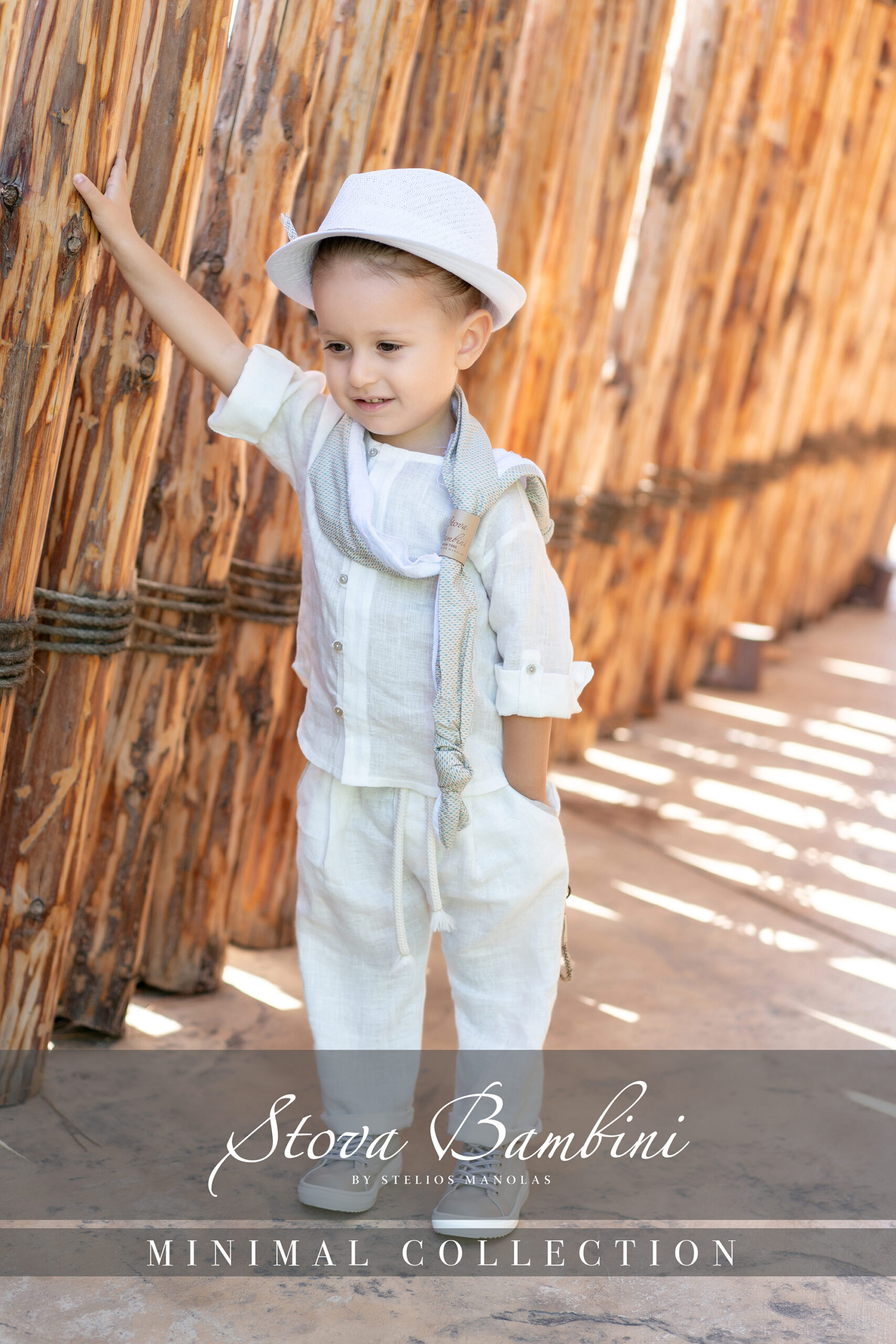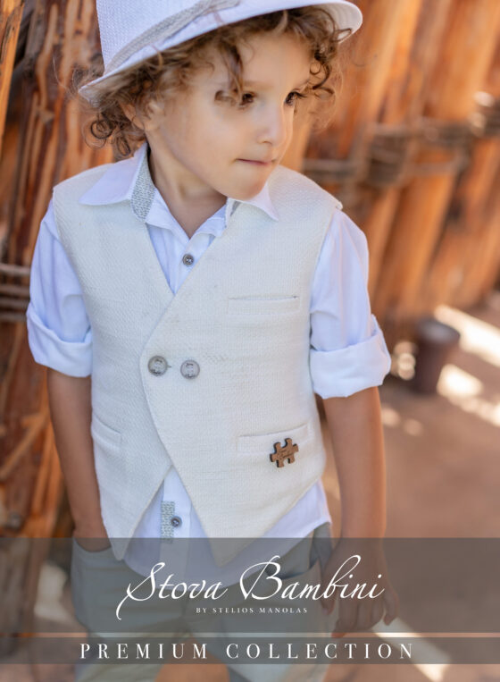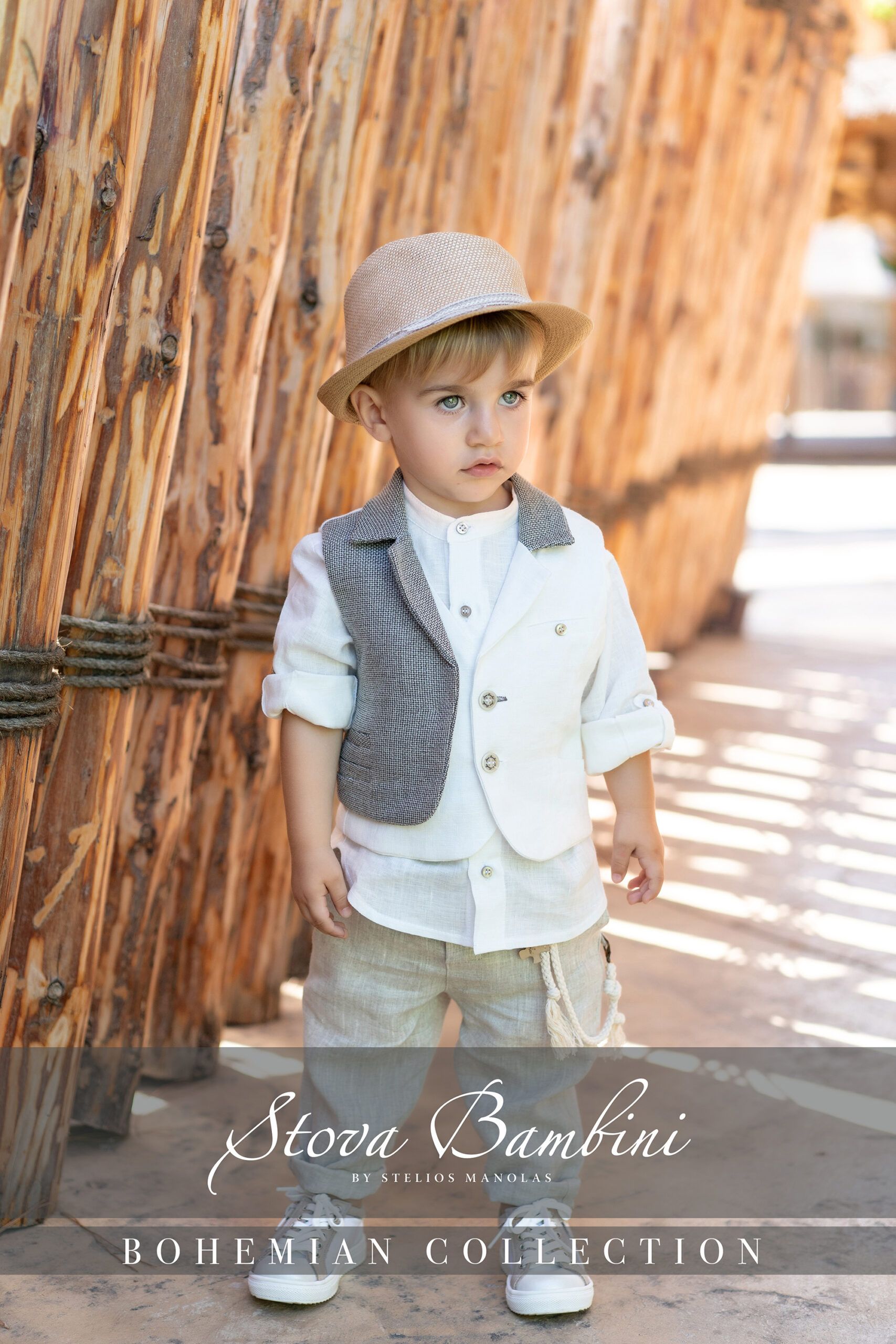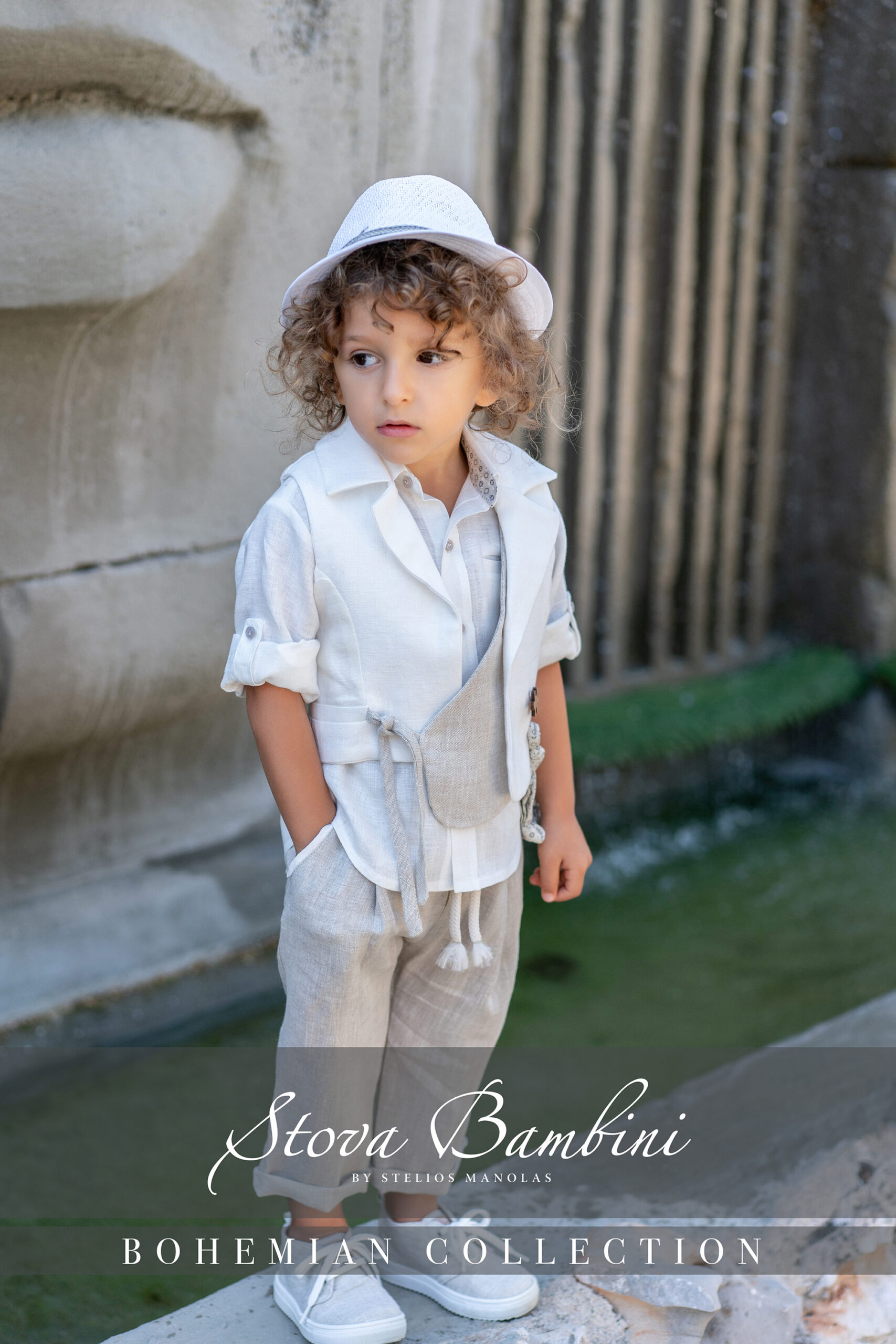 Λινό σύνολο βάπτισης 6 τεμαχίων, σε boho style και απόχρωση off white - μπεζ, που περιλαμβάνει το νέο σχέδιο γιλέκου της Stova Bambini με ένα κούμπωμα και διακοσμητικό διπλό λινό στο ένα κομμάτι του γιλέκου με ανάγλυφη, ανάλαφρη ψάθα. Το παντελόνι είναι σε κλασσική γραμμή με μικρή πιέτα και διακοσμητικό τσεπάκι. Το πουκάμισο είναι λινό σε μάο γραμμή και ασορτί απόχρωση με το γιλέκο. Περιλαμβάνει καπέλο, γιλέκο, πουκάμισο, παντελόνι, ζώνη και διακοσμητικό bohemian αξεσουάρ στο γιλέκο. Συνδυάζεται με ανατομικά παπούτσια από το ύφασμα του ρούχου. Σχεδιάστε τη βάπτιση των ονείρων σας, κάθε ρούχο συνδυάζεται με ανάλογο φιόγκο για το κουτί ή την βαλίτσα σας, λαμπάδα, λαδόπανα, εσώρουχα, πετσέτες και σετ κολυμπήθρας (κεράκια-σαπούνι-μπουκάλι λαδιού), είτε διακοσμημένο και με το θέμα της επιλογής σας. Διατίθεται μεγεθολόγιο Stova Bambini σε όλα τα καταστήματα. Όλη η συλλογή σχεδιάζεται και κατασκευάζεται στην Ελλάδα. Διαθέσιμα μεγέθη: 6-9 μηνών, 9-12 μηνών, 12-18 μηνών, 18-24 μηνών, 24-36 και κατά παραγγελία μεγαλύτερα μεγέθη.
