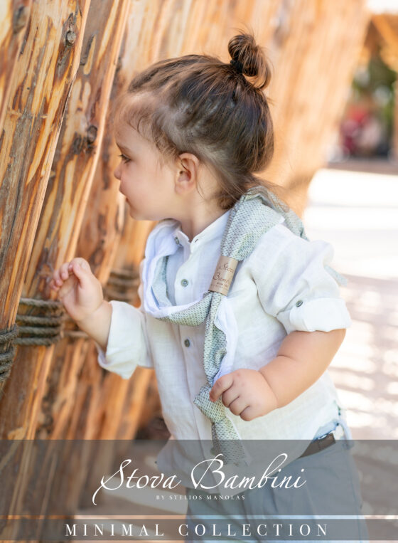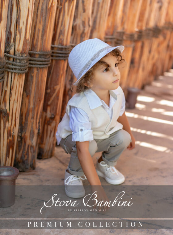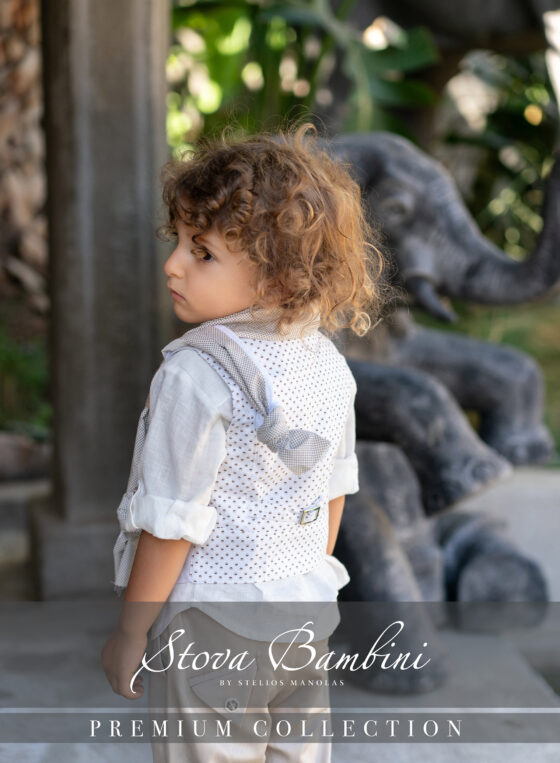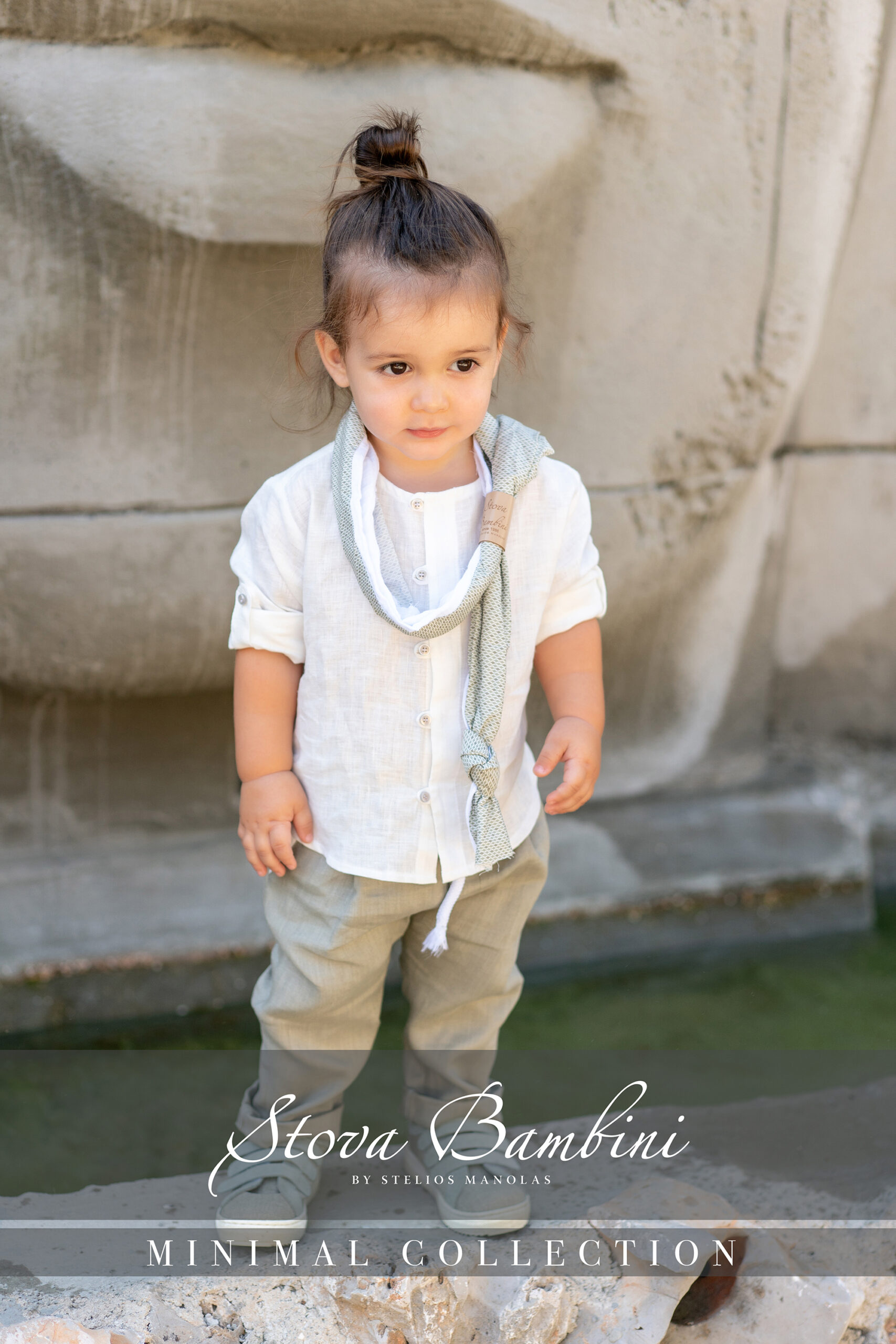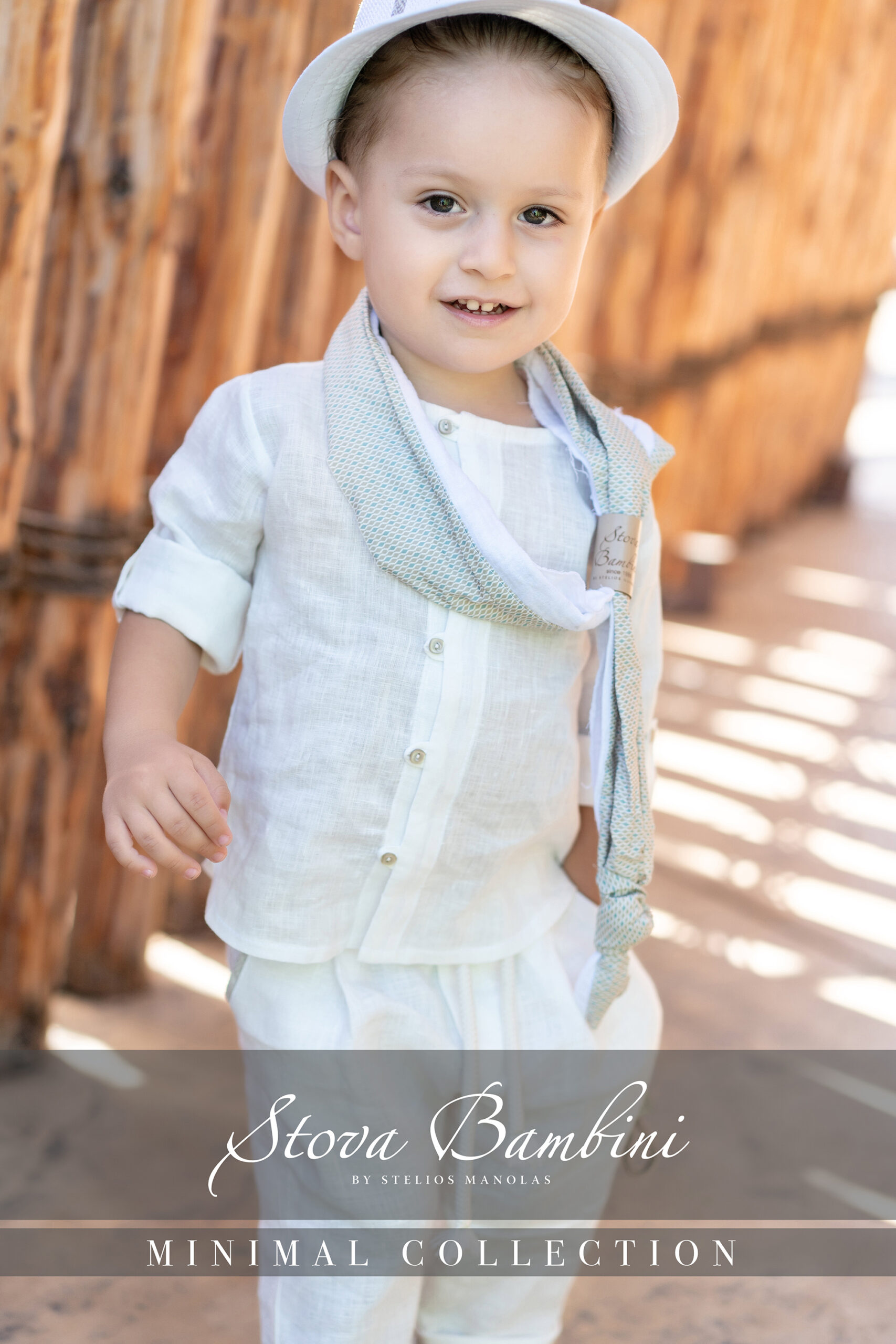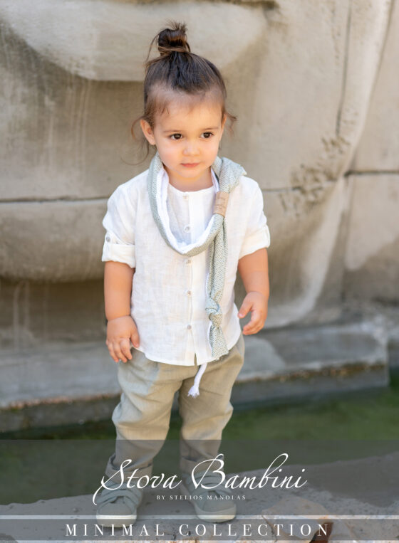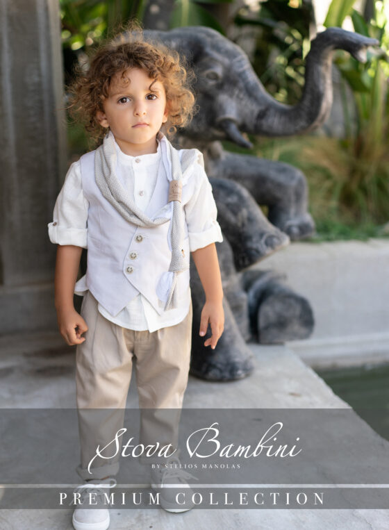 Η νέα σειρά Stova Bambini, μια πιο ανάλαφρη, μοντέρνα πρόταση βάπτισης με υπέροχο νέο, ασύμμετρο πουκάμισο, με διπλά διακοσμητικά τσεπάκια, σε λινό off white. Συνδυάζεται με υπέροχο διπλό φουλάρι σε λευκό και διακριτικό print σε χρώμα tropical yellow brown και δερμάτινο branding catch Stova Bambini από δέρμα νάπα (nappa). Το παντελόνι είναι λινό σε βεραμάν χρώμα με λάστιχο στη μέση, κορδόνι σύσφιξης και διακοσμητικό αποσπώμενο αξεσουάρ στο πίσω μέρος. Το σετ περιλαμβάνει 5 τεμάχια (πουκάμισο, φουλάρι, παντελόνι, διακοσμητικό αποσπώμενο αξεσουάρ, καπέλο). Συνδυάζεται με ασορτί ανατομικά παπούτσια με το ύφασμα του ρούχου εξωτερικά. Σχεδιάστε τη βάπτιση των ονείρων σας, κάθε ρούχο συνδυάζεται με ανάλογο φιόγκο για το κουτί ή την βαλίτσα σας, λαμπάδα, λαδόπανα, εσώρουχα, πετσέτες και σετ κολυμπήθρας (κεράκια-σαπούνι-μπουκάλι λαδιού), είτε διακοσμημένο και με το θέμα της επιλογής σας. Διατίθεται μεγεθολόγιο Stova Bambini σε όλα τα καταστήματα. Όλη η συλλογή σχεδιάζεται και κατασκευάζεται στην Ελλάδα. Διαθέσιμα μεγέθη: 6-9 μηνών, 9-12 μηνών, 12-18 μηνών, 18-24 μηνών, 24-36 και κατά παραγγελία μεγαλύτερα μεγέθη.