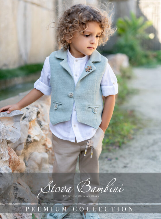 Μια νέα πρόταση σε λινό κοστούμι βάπτισης σε απόχρωση άμμου, ένα από τα best seller του 2024, που το χαρακτηρίζει το ανάλαφρο πατρόν. Το παντελόνι έχει λάστιχο και κορδόνι σύσφιξης στην μέση για εύκολη και άνετη εφαρμογή. Το γιλέκο αποτελείται από βέλγικο λινό άριστης ποιότητας και δένει στο πλάι με μοντέρνο αξεσουάρ δεσίματος και υπέροχο διακοσμητικό αξεσουάρ στο πίσω μέρος του γιλέκου. Το σετ αποτελείται από 5 τεμ (γιλέκο, πουκάμισο, παντελόνι, καπέλο και διακοσμητικό αξεσουάρ) και μπορεί να συνδυαστεί με ασορτί χειροποίητα ανατομικά παπούτσια. Όλα τα υφάσματα των ρούχων είναι από λινό. Σχεδιάστε τη βάπτιση των ονείρων σας, κάθε ρούχο συνδυάζεται με ανάλογο φιόγκο για το κουτί ή την βαλίτσα σας, λαμπάδα, λαδόπανα, εσώρουχα, πετσέτες και σετ κολυμπήθρας (κεράκια-σαπούνι-μπουκάλι λαδιού), είτε διακοσμημένο και με το θέμα της επιλογής σας. Διατίθεται μεγεθολόγιο Stova Bambini σε όλα τα καταστήματα. Όλη η συλλογή σχεδιάζεται και κατασκευάζεται στην Ελλάδα. Διαθέσιμα μεγέθη: 6-9 μηνών, 9-12 μηνών, 12-18 μηνών, 18-24 μηνών, 24-36 και κατά παραγγελία μεγαλύτερα μεγέθη.